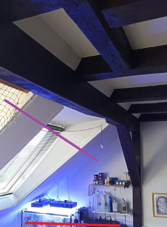 Also ich vermute, dass, wie die Balken in der Decke, die Balken unterhalb auch quer zu der Fensterfront (lila) verlaufen und somit dem roten Strich folgen. Folglich würde das Aquarium jetzt längs auf einem Balken stehen.