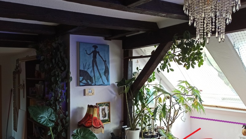 Folgt man dem lila Strich (von oben) nach links, endet es irgendwann hier. Das ist quasi die linke Seite der Fensterfront mit dem selben Deckenaufbau. Hier ist eine feste Ziegelwand, aber nur in dem Stück, wo das blaue Bild hängt. Rechts neben dem Dreieckbalken ist nur noch Rigips.