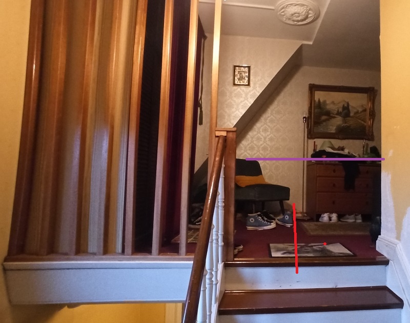 Diese Ansicht erhält man nämlich, wenn man vom vorherigen Bild ca 5m rückwärt geht, die Rigipswand mit dem Bild, trennt das vorherige Zimmer aus der frontalen Sicht, dann vom hausflur. Wäre die Wand mit dem Bild rechts neben der Schräge weg, hätte man also den selben Ausblick wie beim vorherigen Bild.