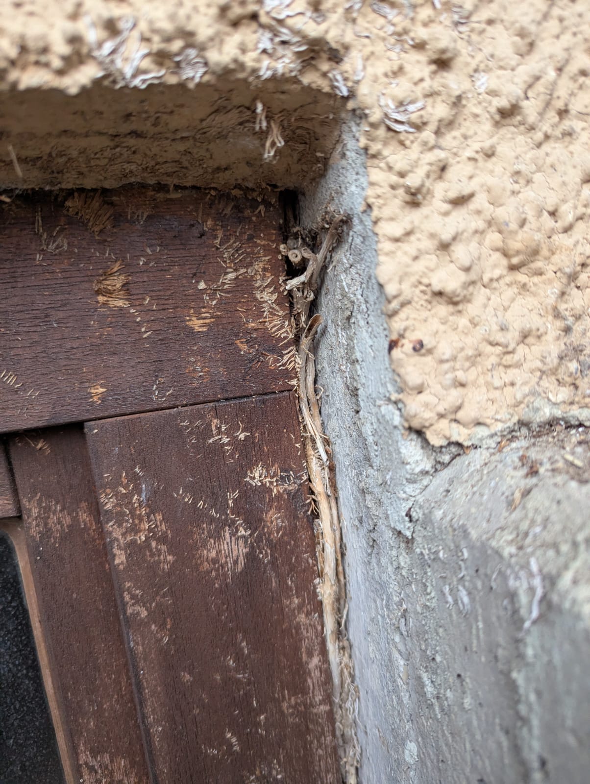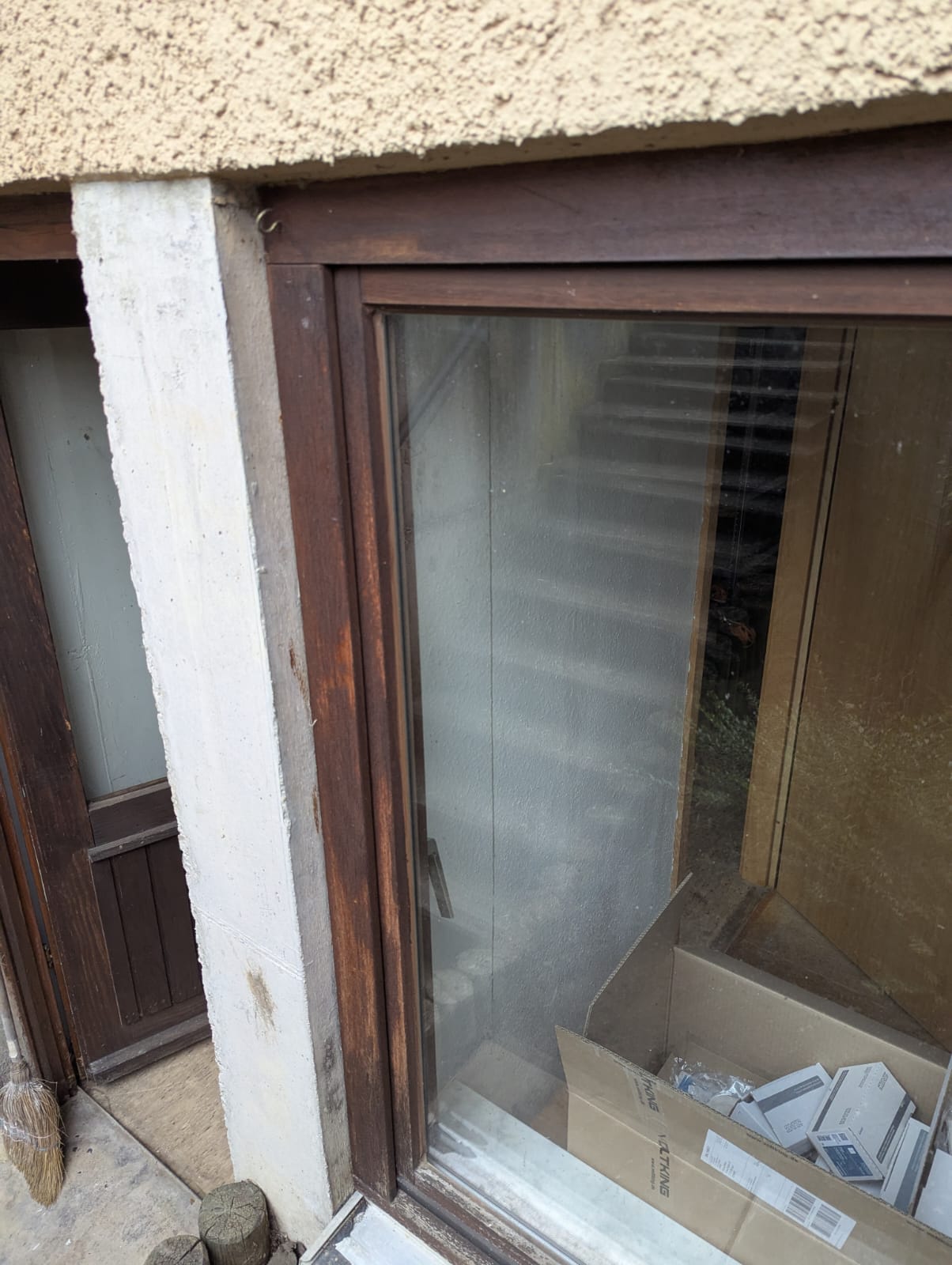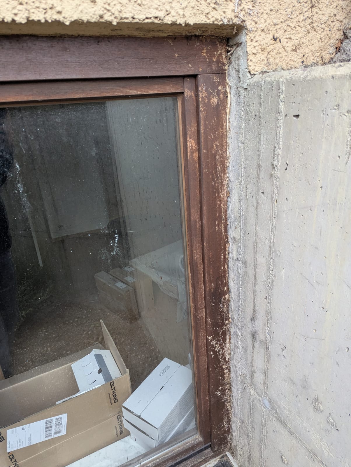 ich möchte das große 160x150 Fenster im UG etwas herrichten und abdichten. Das Holz möchte ich grundieren und streichen, dass es möglichst noch eine Weile hält. Von außen sieht man, dass zwischen Mauerwerk und Fenster etwas Bauschaum eingebracht wurde. Ob dahinter ein Dichtband ist weiß ich nicht; Das ganze ist 40 Jahre alt. In die Lücke ist schön Efeu gewachsen, den ich natürlich entfernt habe (war sehr trocken). Ich hoffe ich habe die Oberfläche des Bauschaums nicht verletzt.
