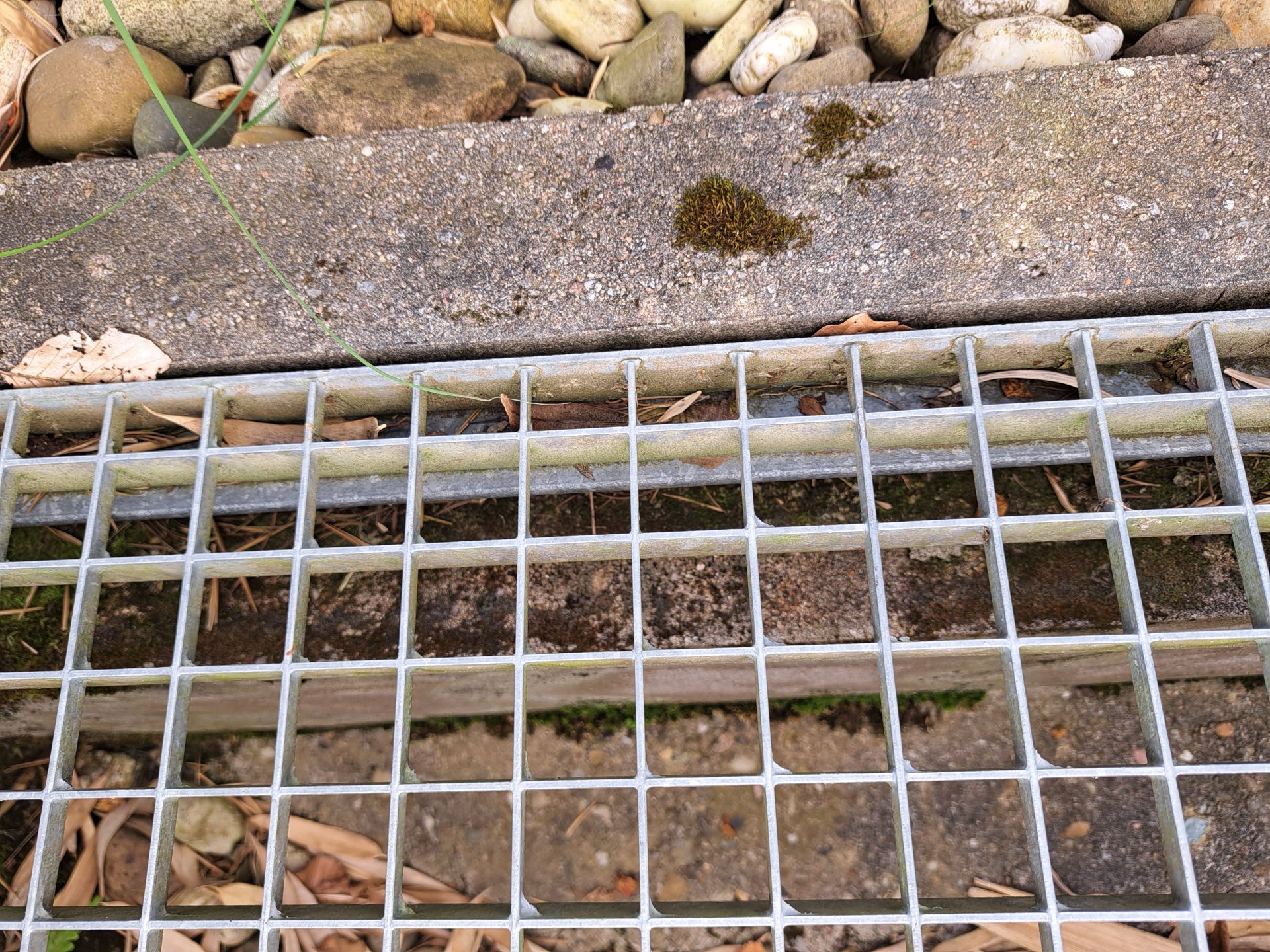 Riffelblech aus Edelstahl. Aluwinkeleisen an den Randstein und gegenüber schrauben und das Riffelblech darauf legen.