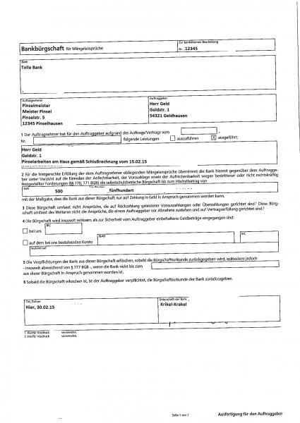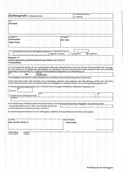 Weitere Frage: Wie wird die überhaupt eingelöst? Also was ist, wenn ein Mangel entsteht? Kann ich dann einfach zur Bank gehen und sagen, gib mir 500€ zur Mängelbeseitigung?
