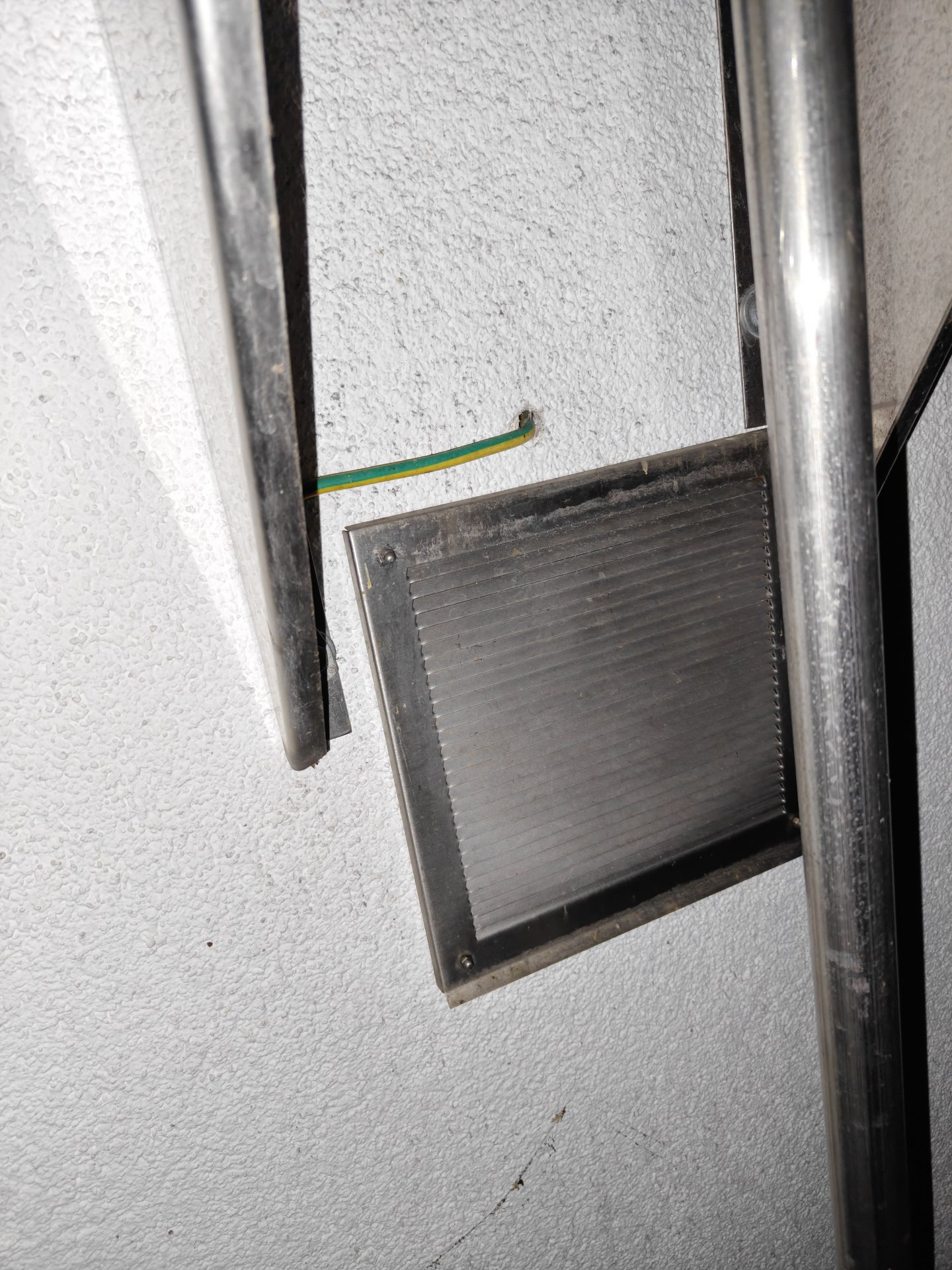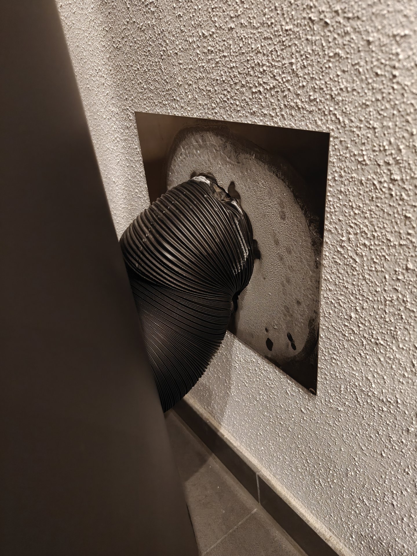 Mutmasslich ist dort einfach nur ein Loch gebohrt worden, so dass durch die aktuell recht kalte Außenluft der Bereich um die Bohrung herum entsprechend abkühlt. Die Metallplatte hat deshalb fast Außentemperatur. Abhilfe könnte eine gedämmte Wanddurchführung schaffen. Den Zuluftschlauch zu dämmen wäre m.E. auch nicht verkehrt.