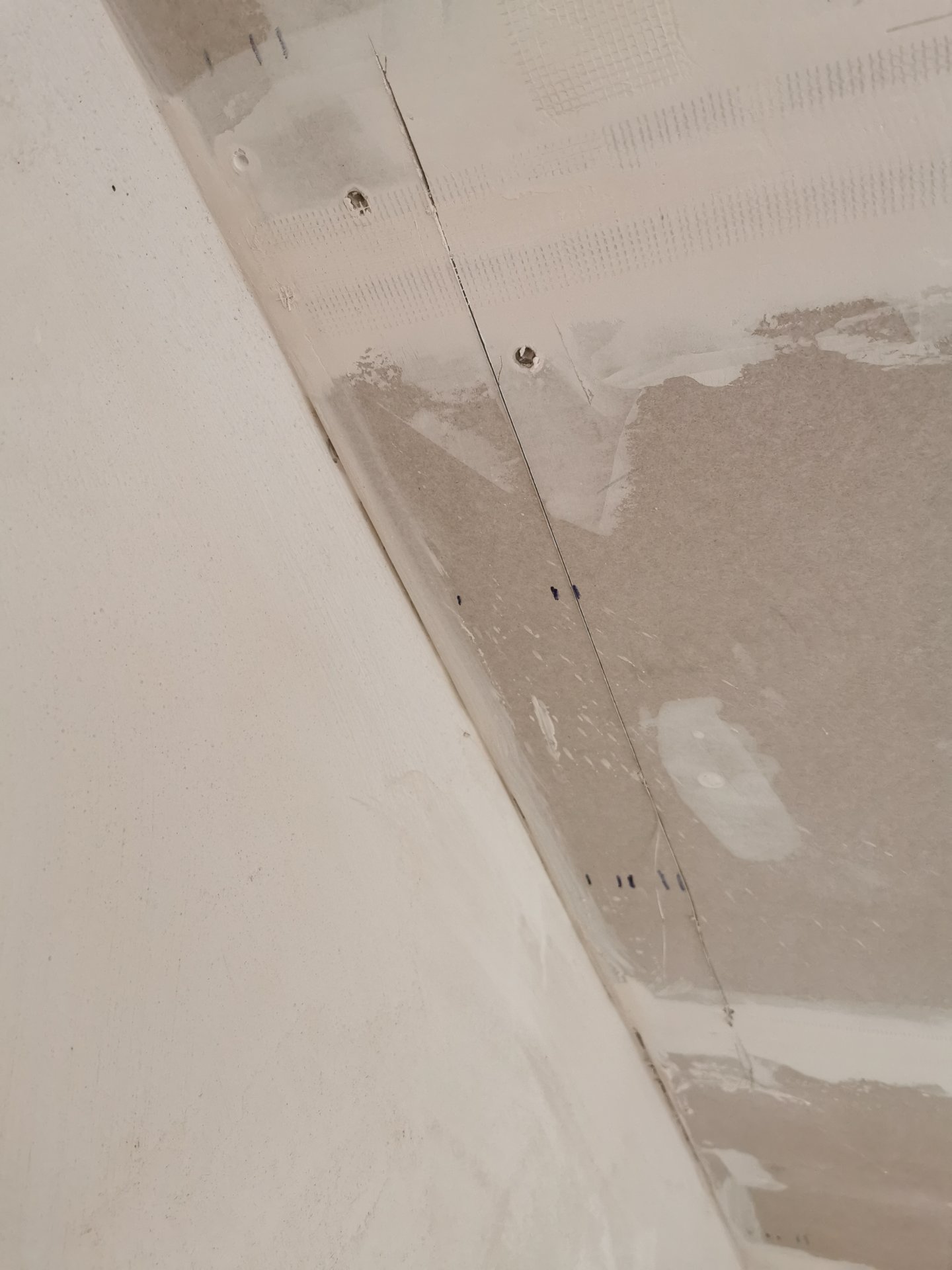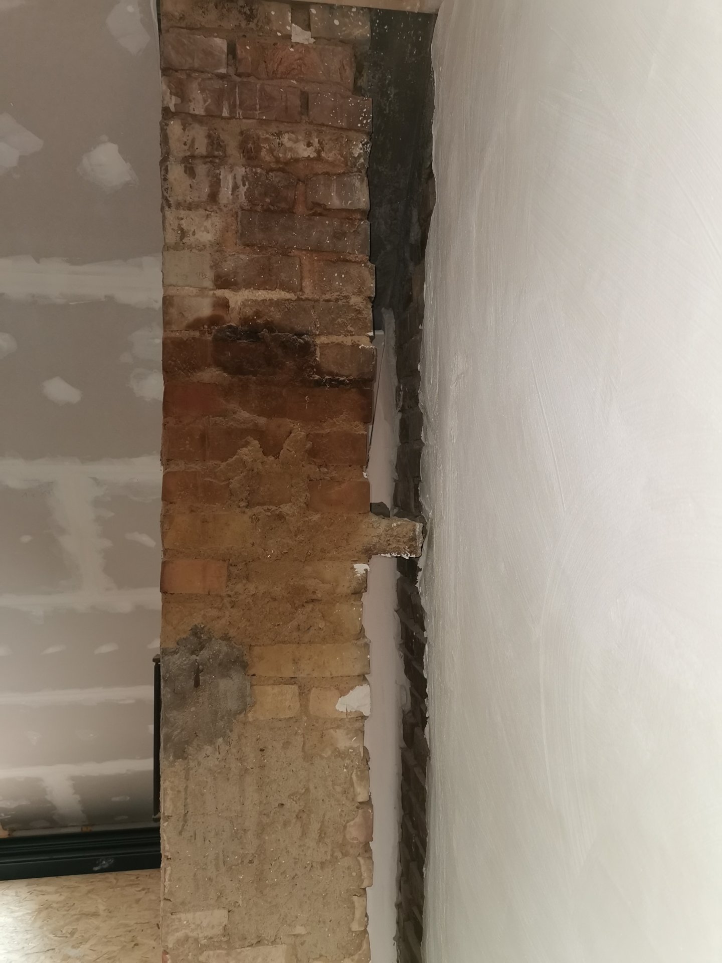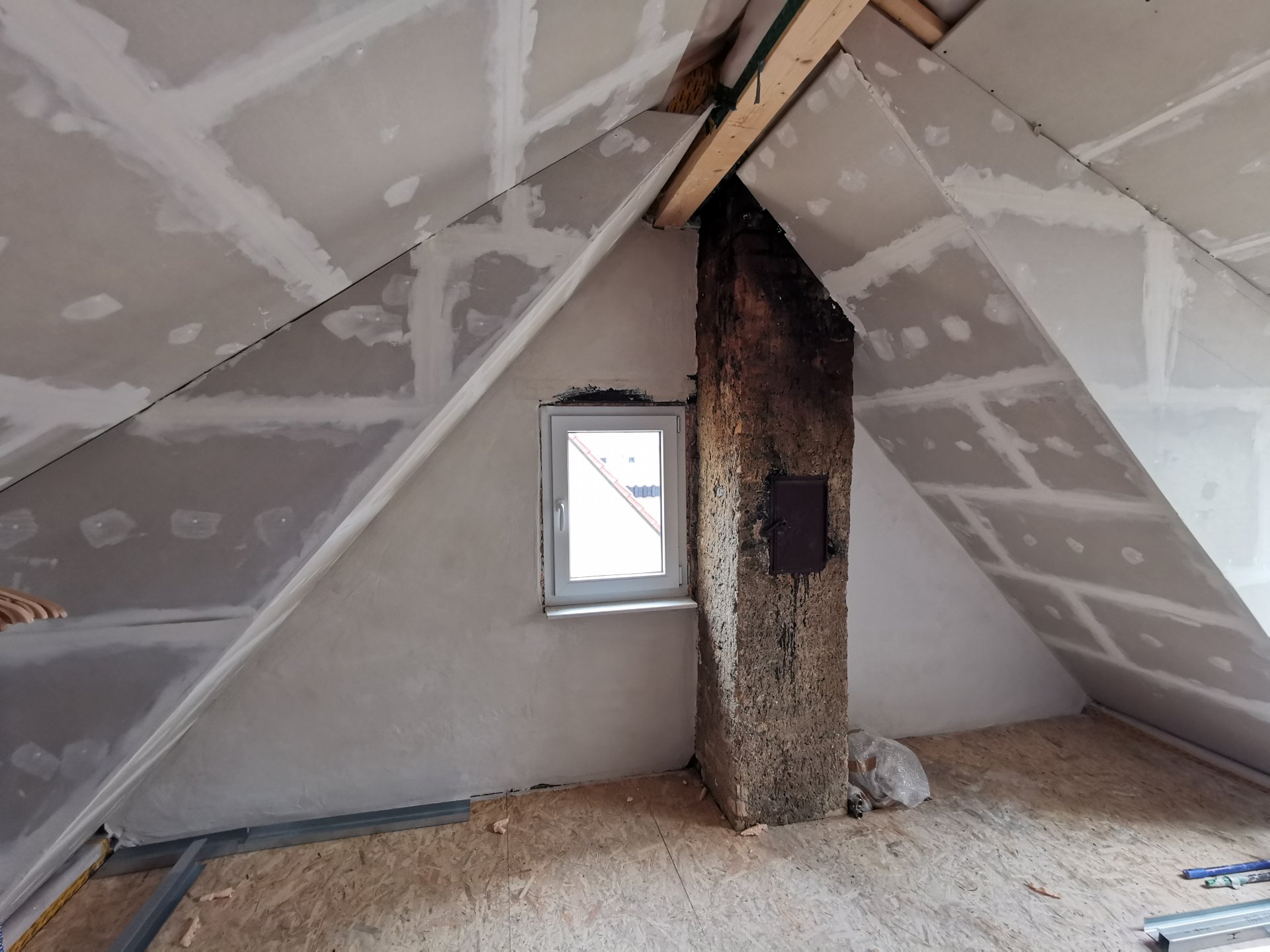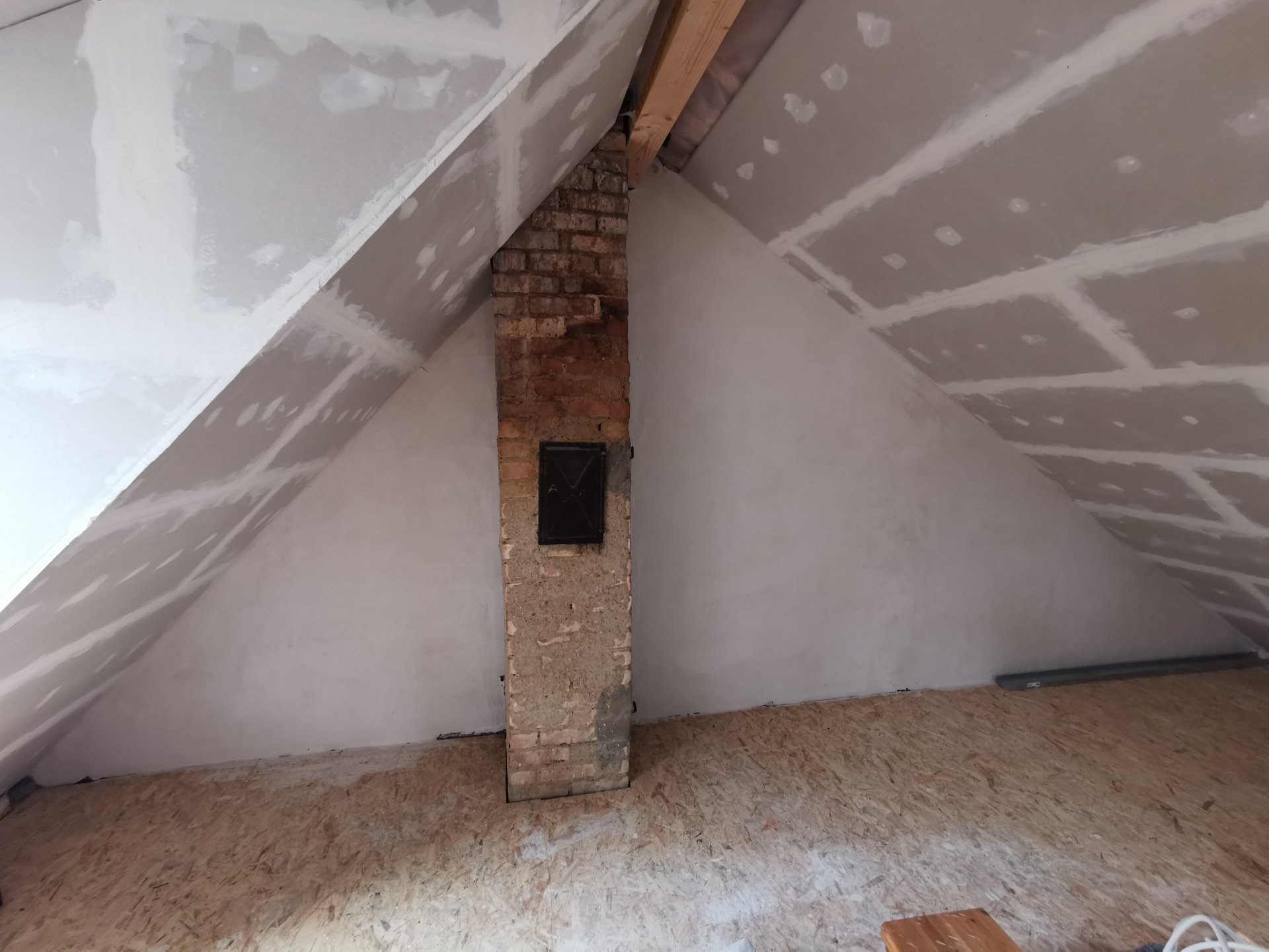Also erstmal hätte man die Kamine fertig machen sollen BEVOR man die Decke mit Gipskarton fertig macht. Ich frag lieber gar nicht, wie die Dampfbremse des Daches an die Kamine angeschlossen wurde. Wahrscheinlich aber nicht fachgerecht.