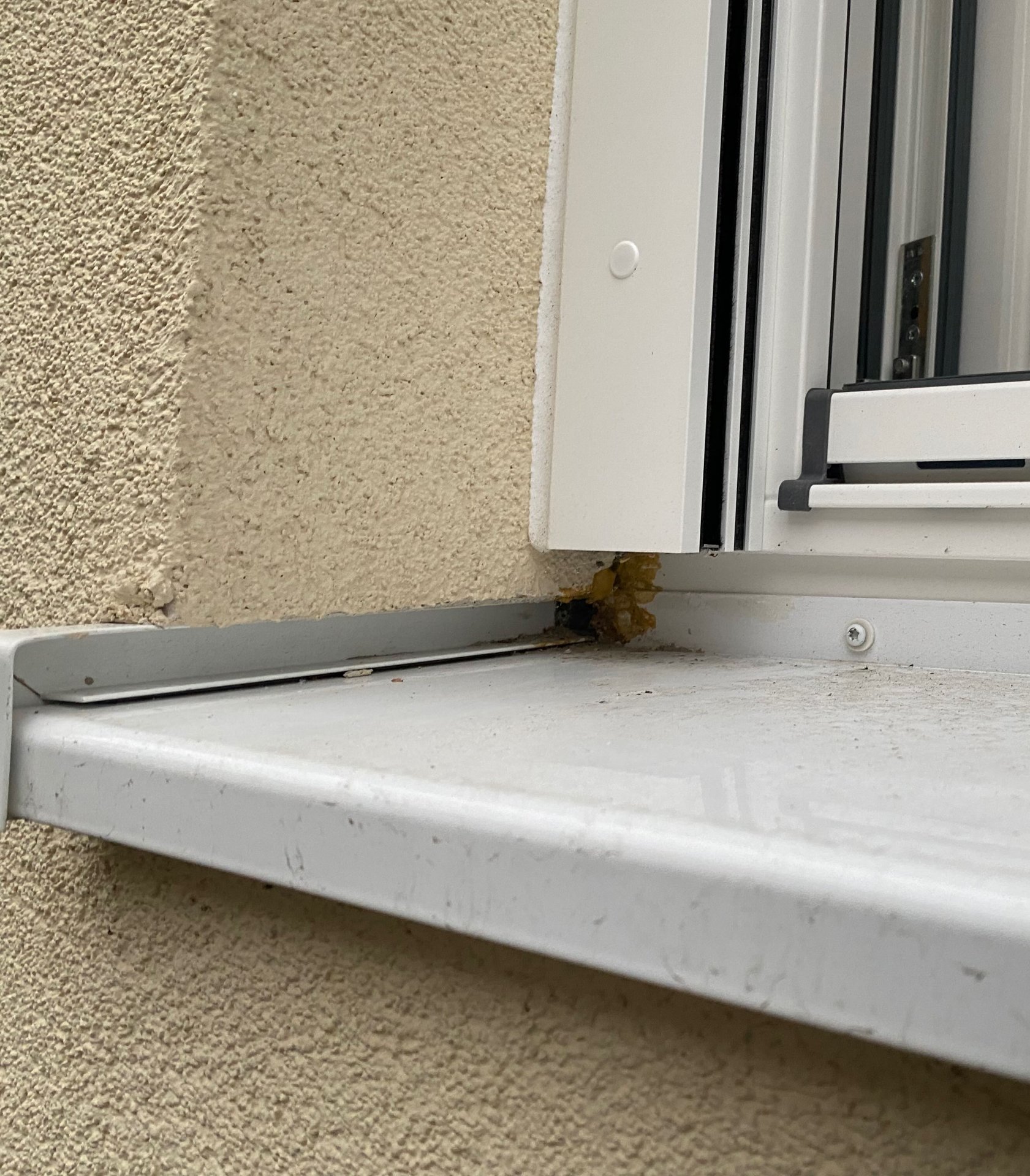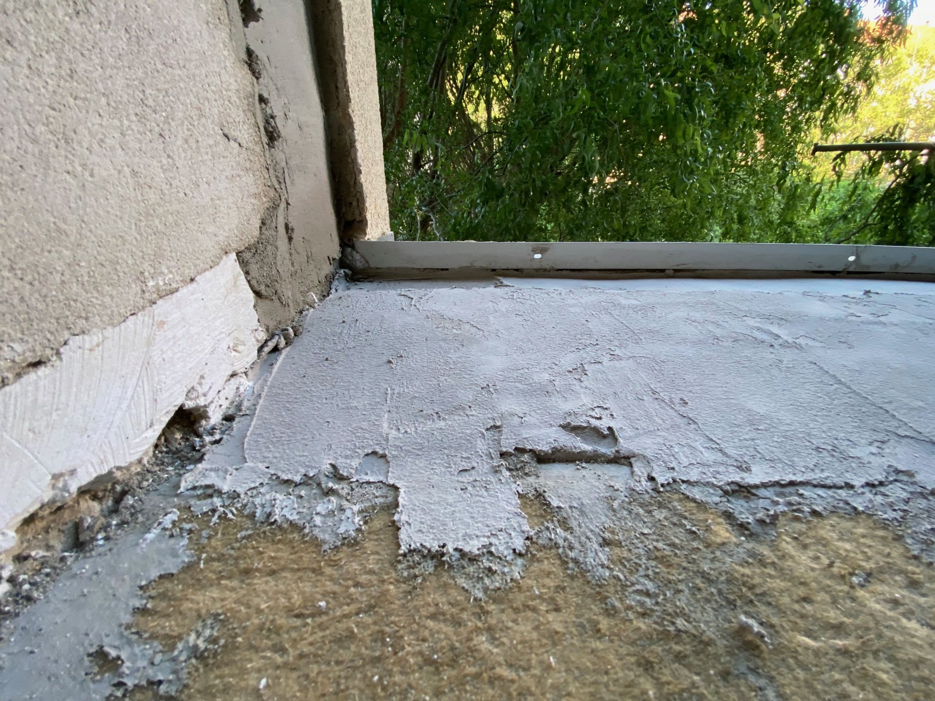 Die Fensterbank außen wurde vor 3-4 Jahren im Zuge der Fassadensanierung ausgetauscht und im Rahmen des Fenstereinbaus vor 2-3 Mo. beibehalten. Sie wurde nicht mal ausgebaut bei der Montage. Ich vermute das ist PU-Schaum auf der Fensterbank. Hier ein Foto vorm Einbau der Fenster vom Glattstrich. Es wurden Dichtbänder bei der auf die Alufensterbank und Holzfenster reingegeben zur Abdichtung.