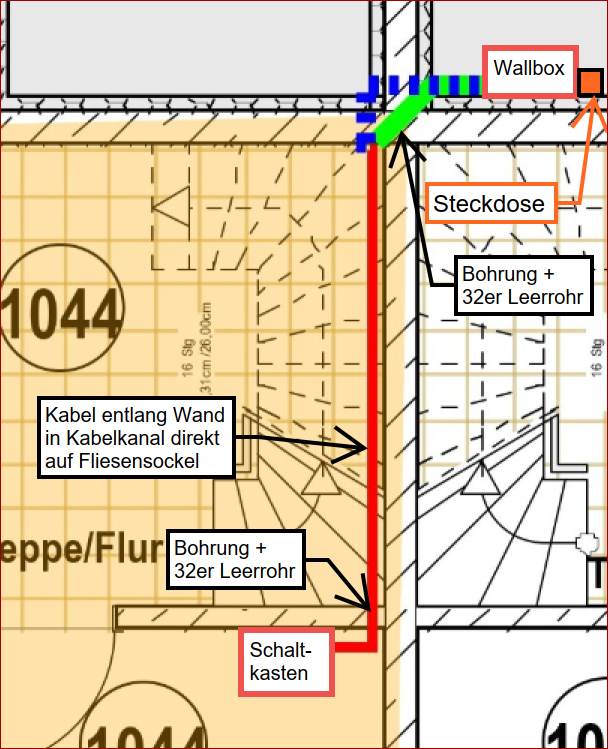 Diskutiere Kabel durch Wandecke (mittels Bohrung) im Elektro 1 Forum im Bereich Haustechnik; ich würde gerne eine Wallbox + normale Steckdose in meinem TG Parkplatz installieren lassen. Unten ist mein Verlegungskonzept. Fragen: 1) ist...