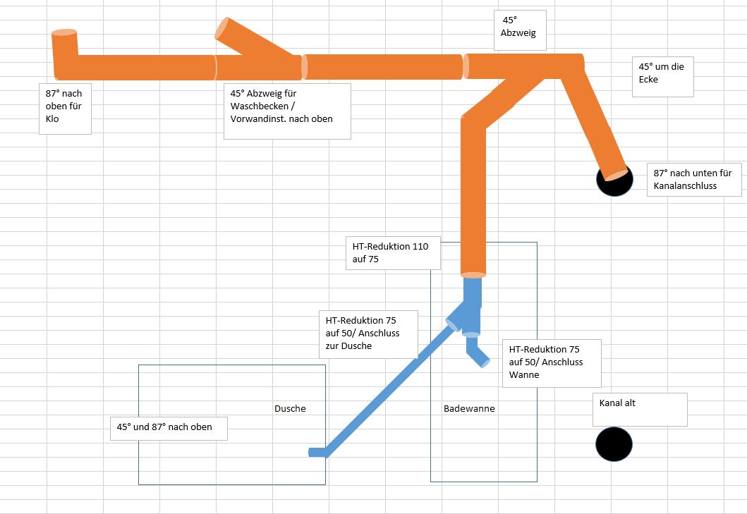 Eigentlich wollten wir mit einem Doppel-HT-Abzweig den kürzeren/ direkten Weg zu Wanne und Dusche gehen, aber so wie es ausschaut, sollte man am Hauptanschluss Doppelabzweig vermeiden. Wir haben uns nun diese Alternative überlegt - wir müssen bis zum Ende ca. 4 m überbrücken, kommen im gesamten auf 6 - 7 cm Gefälle.