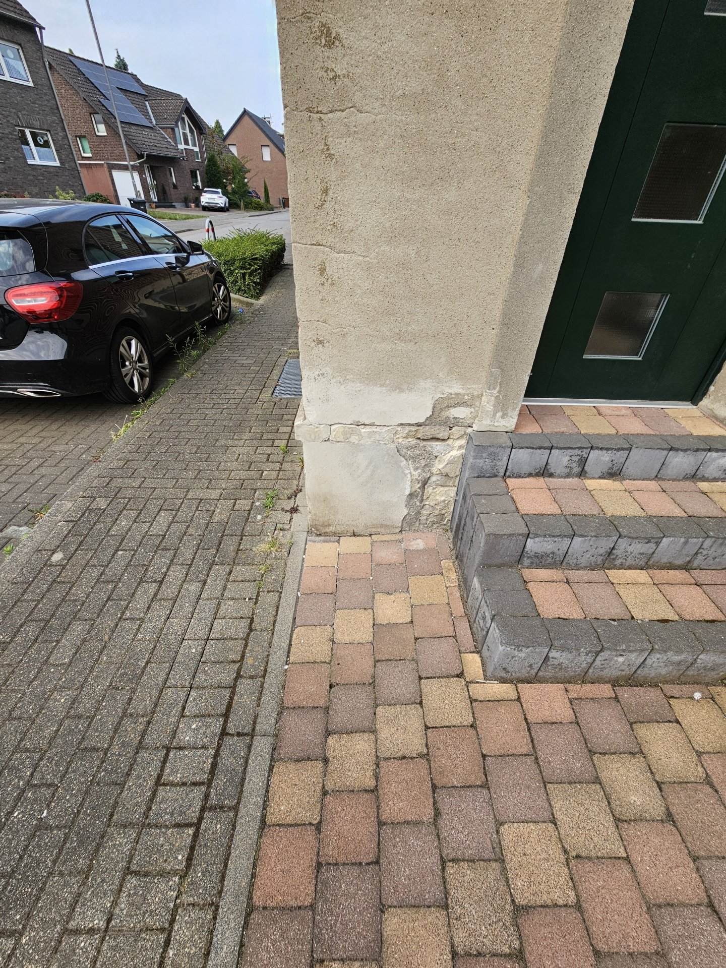 Leider ist der Keller von Außen nicht gut erreichbar, eine Seite ist direkt am nachbarhaus ca 3m sind frei, die andere Einfahrt und Garage, im Garten ist der Bereich bis 4 Meter vom Haus weg erhöht und gefliest, direkt vor dem Haus der öffentliche Gehweg.