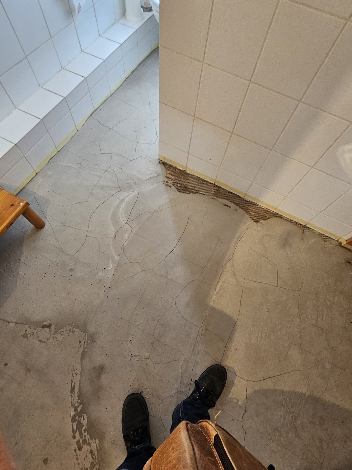 Was haltet Ihr von den unvollendet Boden im Bad, sieht aus wie eine Ausgleichsmasse die auf ein Netz gegossen wurde, ist aber überall gebrochen.