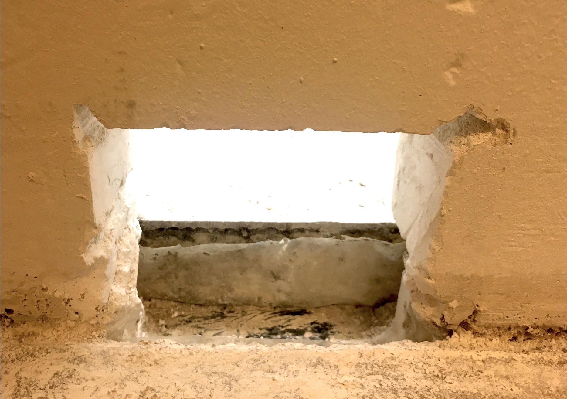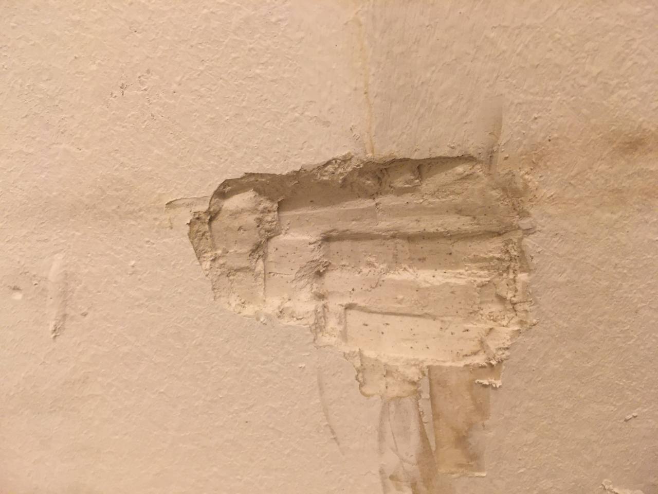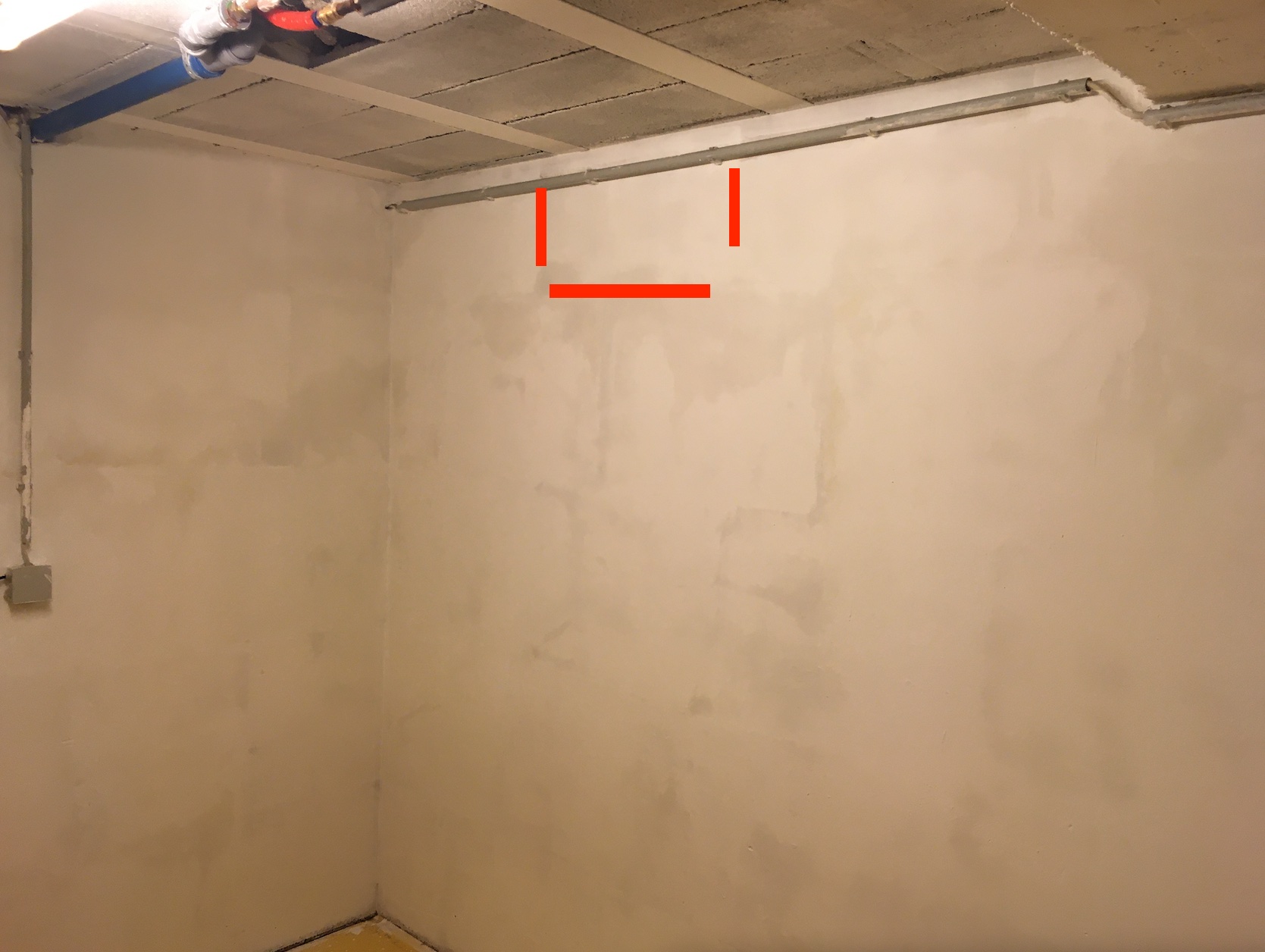 Ich kann die Wasserisolierung in diesen Schlitz gieße und ihn dann mit Beton ausgleiche. Danach kann ich eine weitere Isolierschicht anbringen und dann die Gipswand flicken.