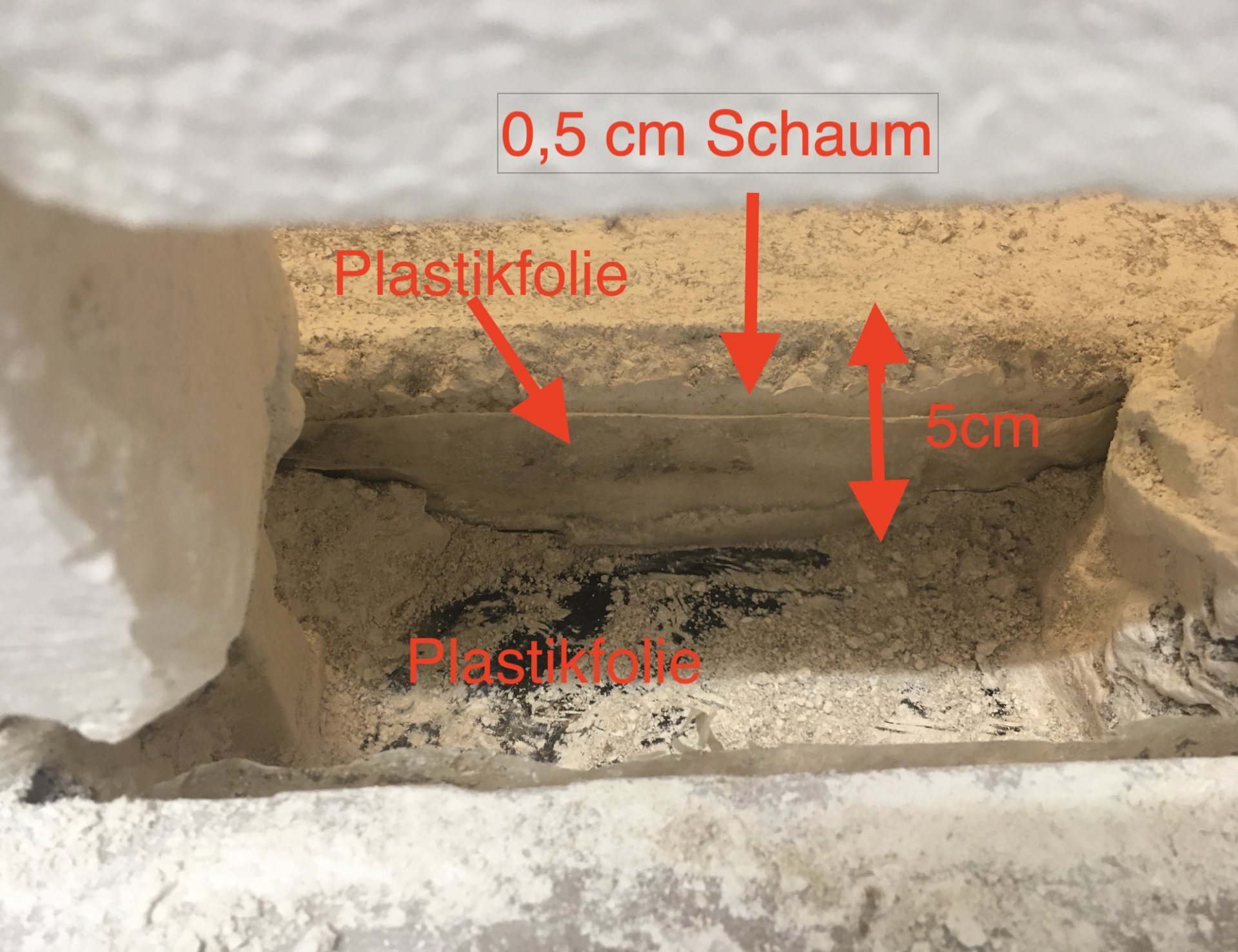 Ich möchte die Idee ausprobieren, die Gipswand horizontal durchsaegen und den Basis der Wand zu ersetzen. Ich habe das Stück der Wand entfernt und festgestellt, dass nur eine dünne Plastikfolie die Gipsplatten vom darunter liegenden Beton trennt (siehe Fotos). An den Seiten scheint es eine zusätzliche dünne Schicht aus Schaumstoff zu geben.