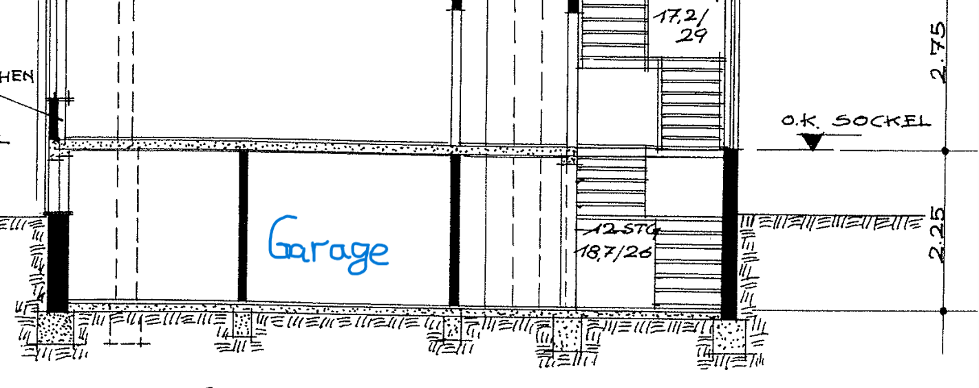 ich überlege ein Zweifamilienhaus aus der Verwandtschaft zu übernehmen und habe mir die Baupläne mal angeschaut. Das hat rechts und links Hang, aber frontal guckt der gesamte Keller aus der Erde heraus und die Kellersohle ist ebenerdig mit der Straße. Im Anhang der Schnitt aus dem Baujahr 1960. Es scheint keine richtige Bodenplatte zu sein, sondern nur Streifenfundamente. Da der mittige Raum eine im Haus integrierte Garage ist, dachte ich, da könnte man doch eine Wohnung reinmachen, da auf dem Grundstück genug Stellplätze sind.