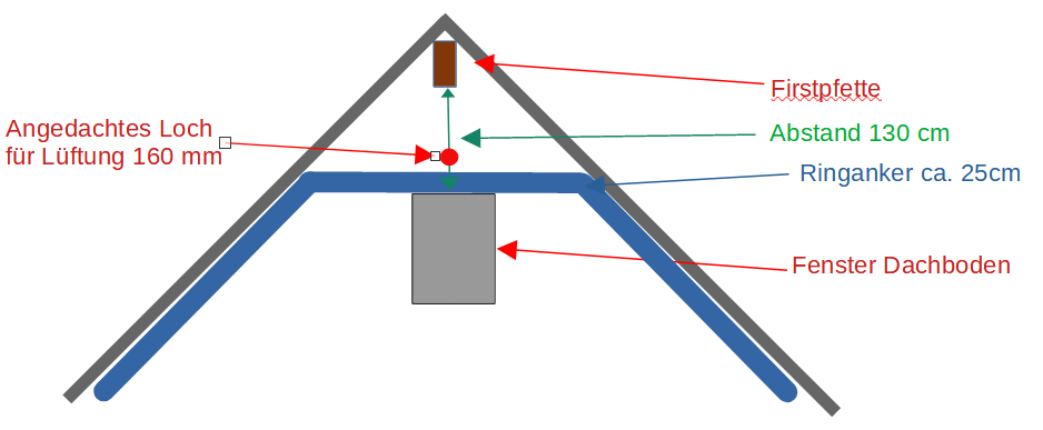 Von Außen würde es am elegantesten aussehen, wenn sich die Kernbohrungen (je 165mm) oberhalb des Fensters befinden. Jetzt stellt sich mir jedoch die Frage, ob es statisch überhaupt möglich ist, an der geplanten Stelle das Loch zu bohren, da sich dieses zwischen Ringanker und Firstpfette befindet.