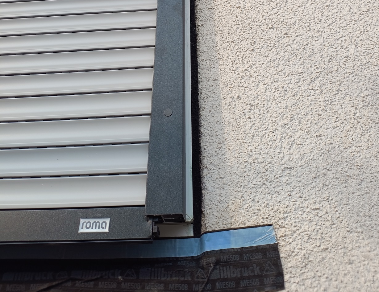 Der alte Rolladen wurde durch Roma Vorbaurolladen ersetzt. Der (hinterdämmte) Kasten wurde in die Dämmung integriert, die Führungsschienen laufen auf dem Fensterrahmen.