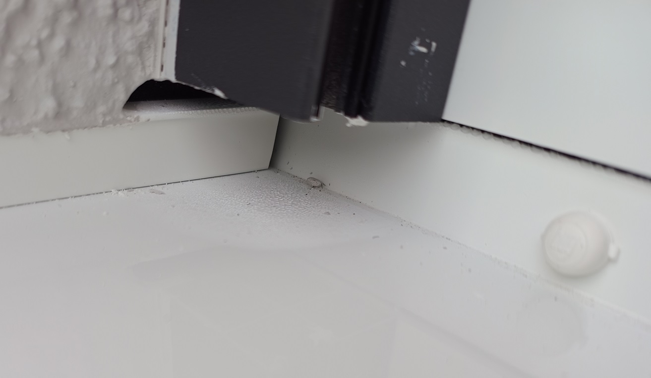 Woher kann hier die warme Luft kommen, die zu dieses Kondenswasserbildung führt? Ist der Einbau der Fenster, Fensterbänke oder Rolladenschienen fehlerhaft ausgeführt worden?