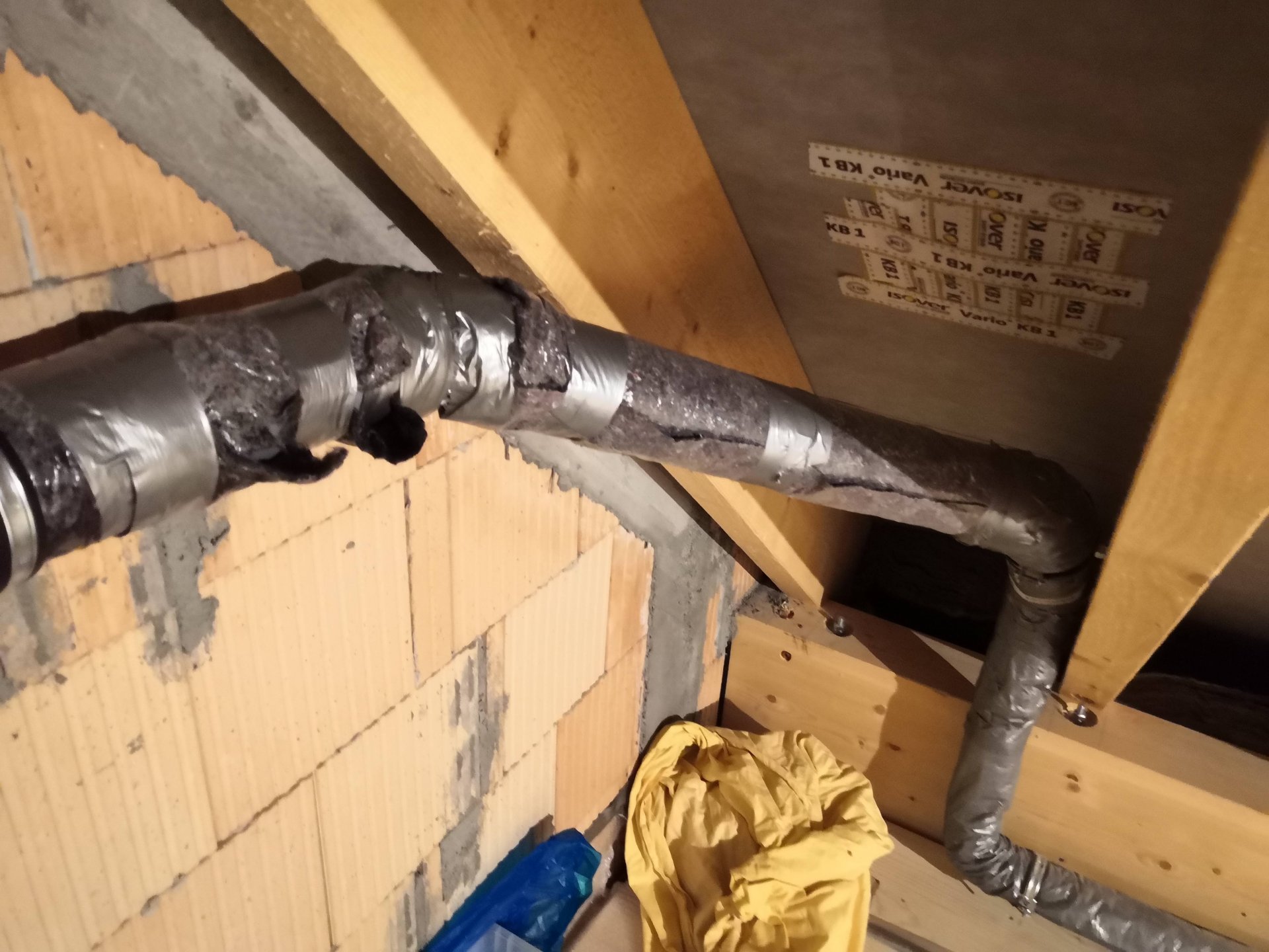 Die Rohrdämmung halte ich dort sowieso für überflüssig. Sie wird nur auf dem ersten Meter oberhalb der Deckendurchführung benötigt. Das übrige Rohr sollte ohne Dämmung verlaufen. Es sollte mit einer entsprechenden Dichtmanschette durch die Unterspannbahn geführt werden (linke Seite). Die dortige Ausführung mit Rohrdämmung und Klebeband ist sinnlos und versteckt nur darunter befindliche Fehlstellen.