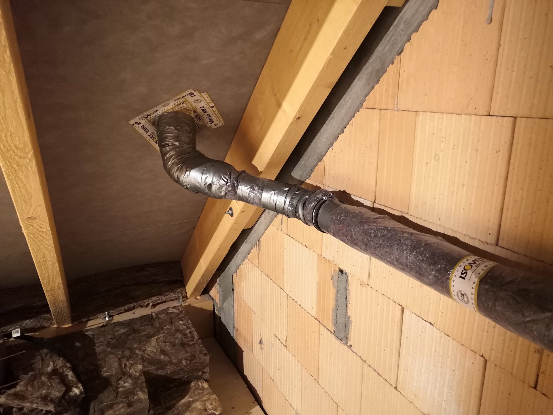 Ursprünglich erfolgte die Entlüftung auf der rechten Dachseite. Ich musste die Entlüftungspfanne jedoch wegen der Installation einer PV Anlage auf die linke Dachseite verlegen. Hierzu wurden ca. 3 Meter HT-Rohre verwendet, welche mit etwas Vlies gedämmt wurde.