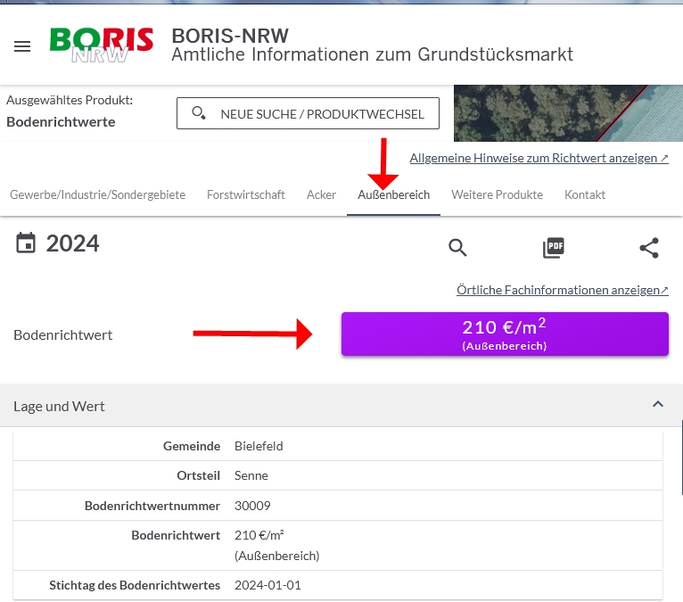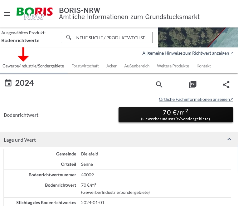 Ist die Immobilie dem Gewerbegebiet zugeordnet, dann beträgt der BRW 70 EUR/qm.