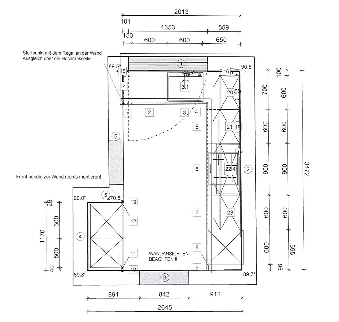 Diskutiere Küchenwände im Baumurks in Wort und Bild Forum im Bereich Rund um den Bau; Ist es gemäß DIN 18202 zulässig, dass der Winkel in der oberen rechten Ecke 90,5 Grad beträgt, was über 3,5 Meter eine Abweichung von 3 cm...