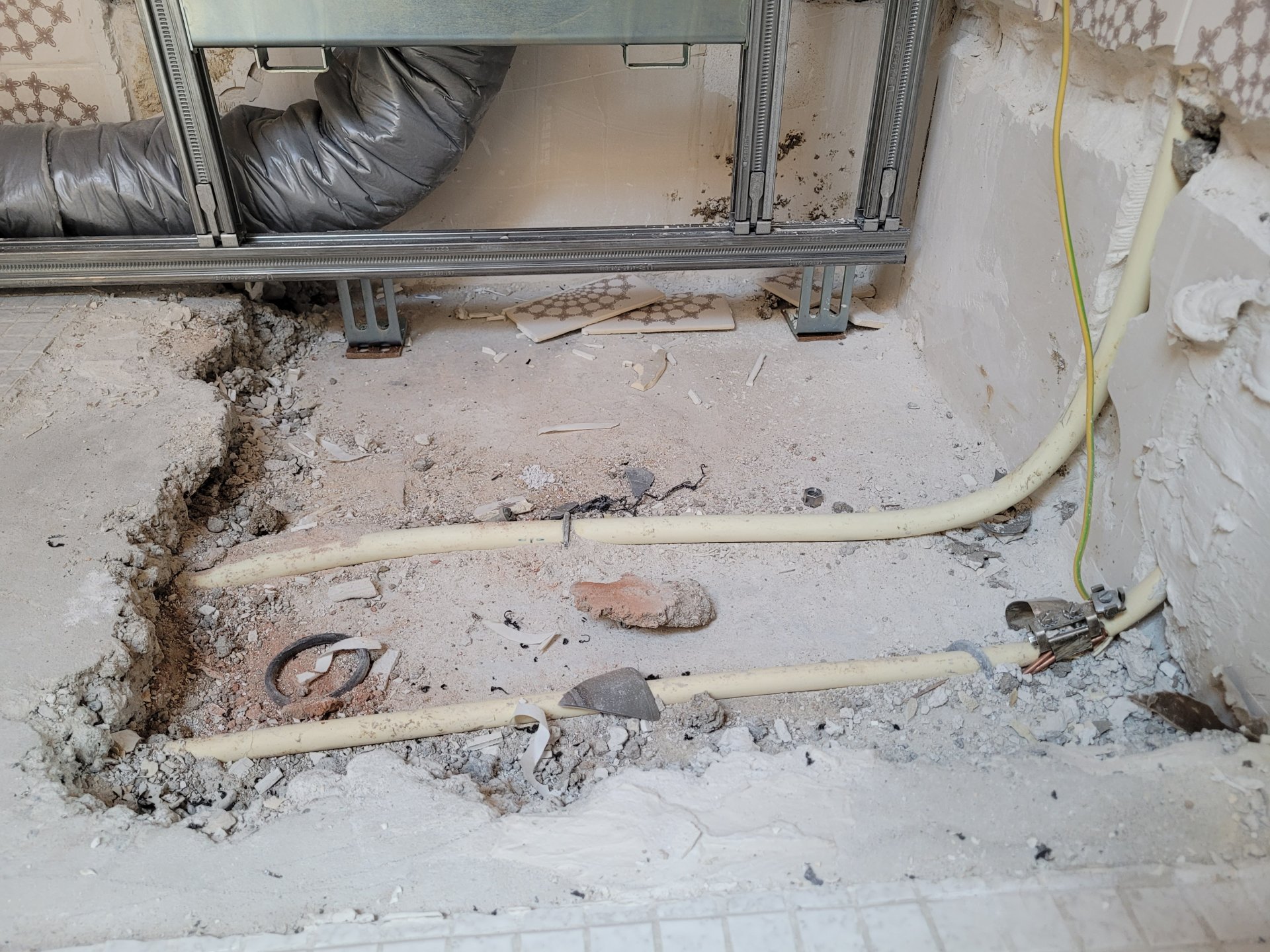 Ich sehe keinerlei Dämmschicht. Alles homogene Estrich. Die beiden Leitungen sind die alten Kupfer Wasserleitungen zur (ehemaligen) Dusche. Die sind ab vsl. Montag nicht mehr angeschlossen, wenn der Sanitärler auf die neuen Wasserleitungen "umklemmt".