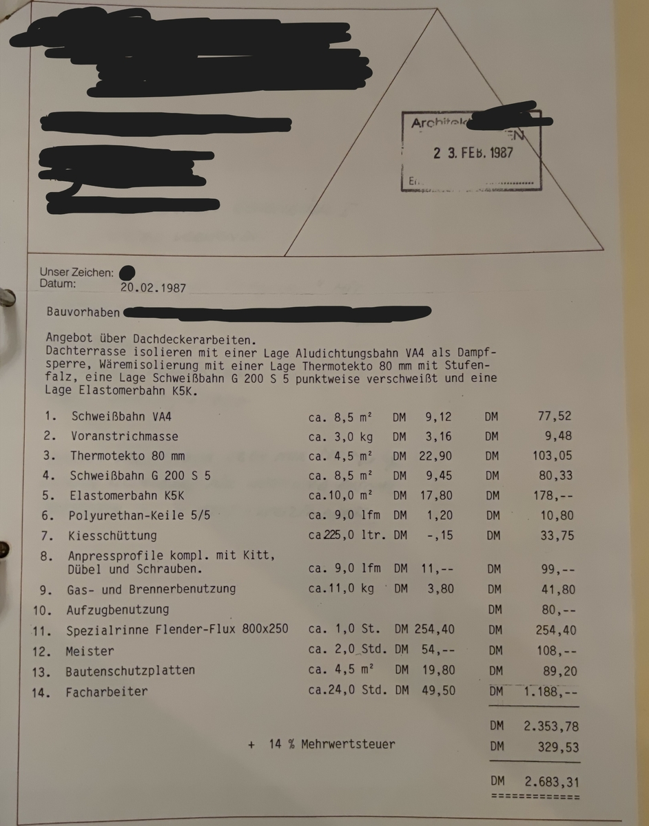 Prof Neufert hatte einst die Idee mit dem bewässerten Flachdach. Aber das Wasser bleibt nicht Wasser, sondern wird im Winter zu Eis und dehnt und streckt sich mit der angefrorenen Dachpappe oder Bitumenbahn.