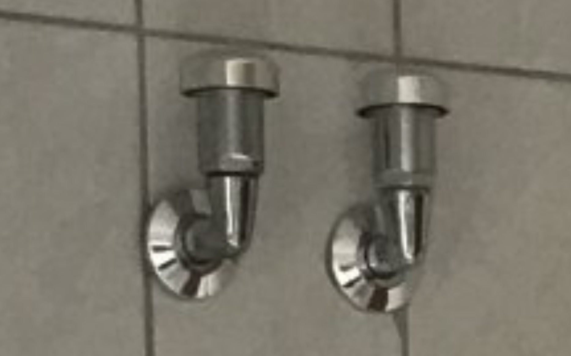 Metallische Rohrstücke ca. 2 m hoch in der Badwand – einer dauerhaft warm, einer kalt – wofür s