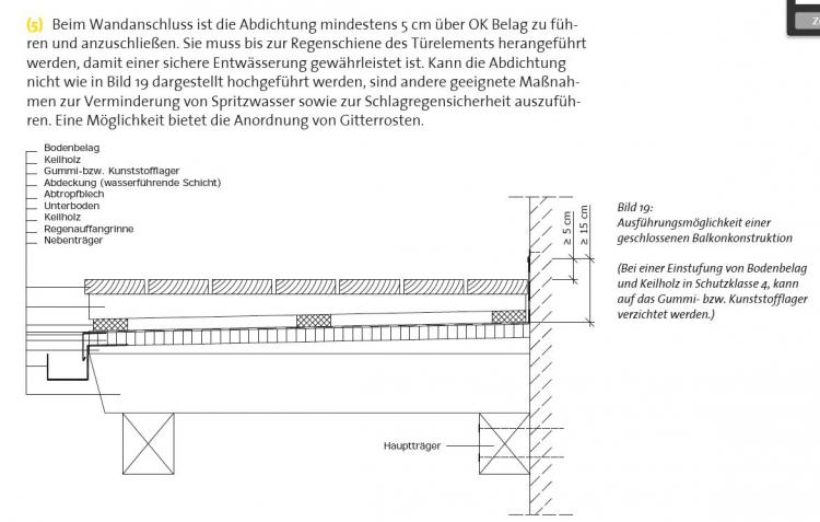 Die Abdichtung von Balkonen und Terrassen gehört nicht zum Kernbereich des Zimmermannshandwerk. Warum Zimmerleute gleichwohl meinen, die Fachregeln des zuständigen Gewerks umschreiben zu können, ist für mich nicht nachvollziehbar. Ein Verweis auf die DIN/Flachdachrichtlinie und Gitterrost am Wandanschluß in der Zeichnung hätten ausgereicht.