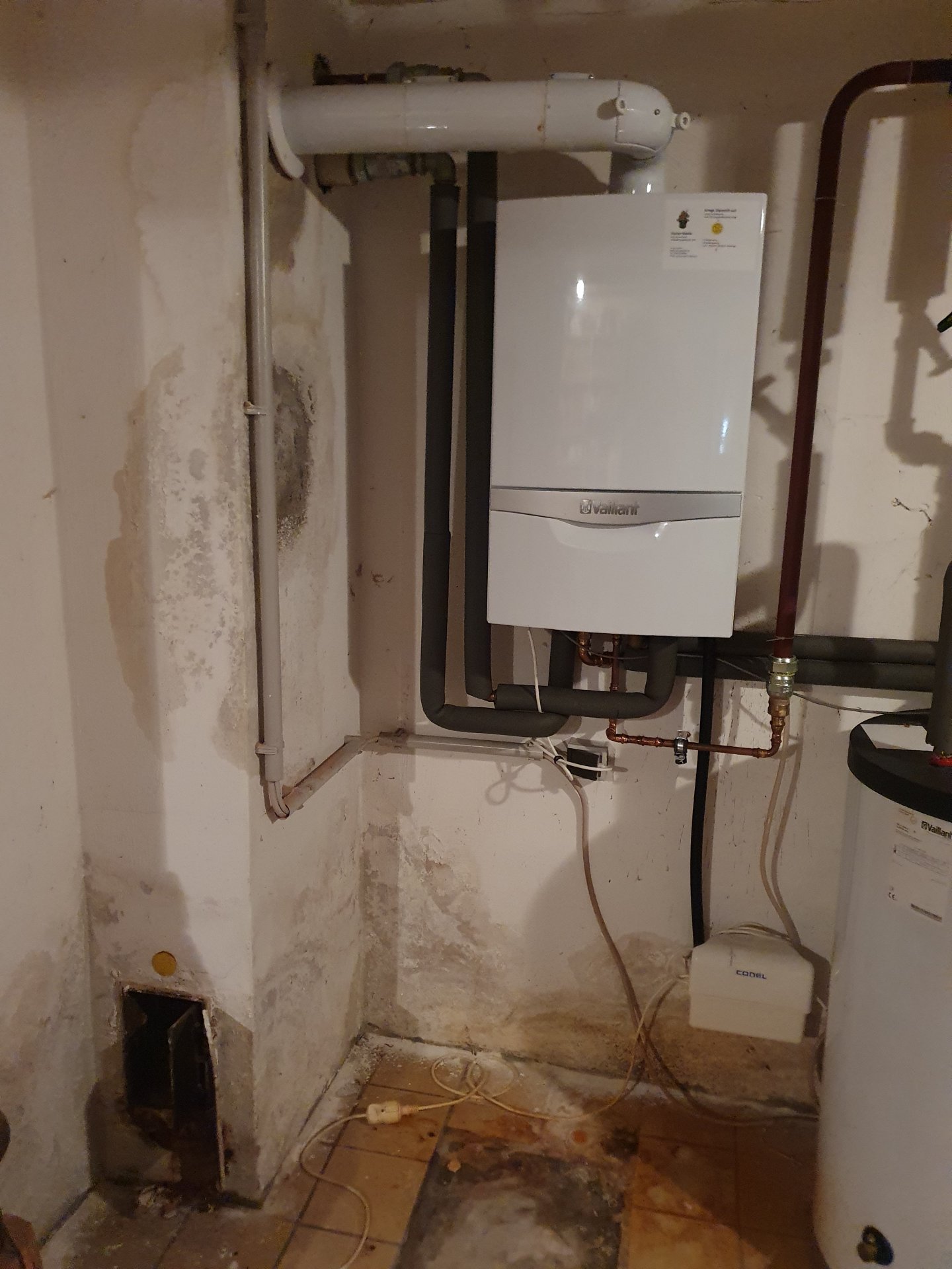 Vaillant liefert eine Stützkonsole mit. Diese sitzt genau am Fußpunkt der aufgehenden Leitung. Den Bereich würde ich mir ansehen ( Bohrung drunter und Hohlraumkamera nutzen )