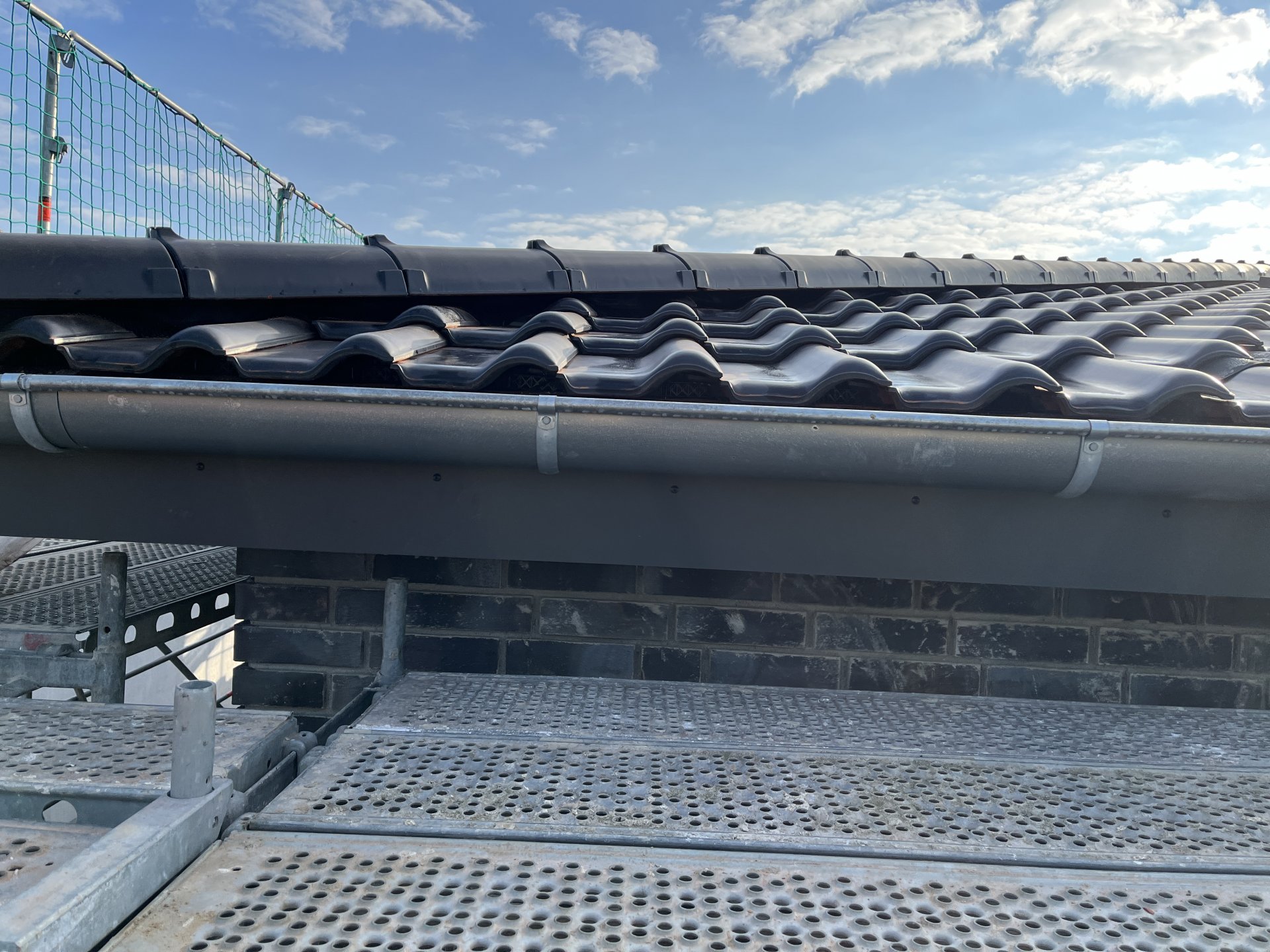 Wir haben ein Dach mit einer Neigung von 12 Grad. Jedenfalls wurde die Keilbohle ziemlich waagerecht angebracht und der Weg zur Regenrinne ist vergleichsweise lang. Dazwischen wurden Kämme für die Hinterlüftung angebracht.
