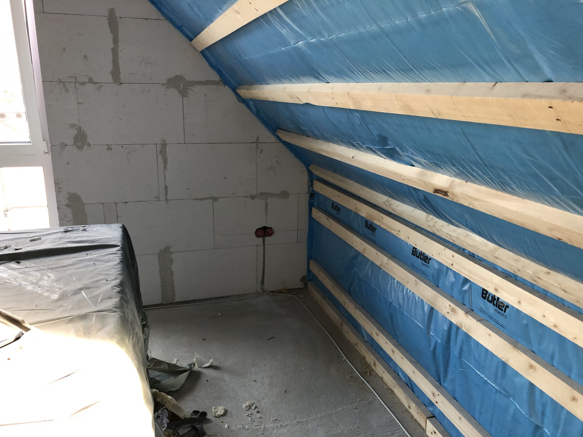 Neubau - Dämmung Dachschräge nass: Hallo liebe Bauexperten, wir bauen gerade ein KfW 55 Haus aus Porotonziegel und ein Satteldach als Kaltdach. Ende September kam der Innenputz...