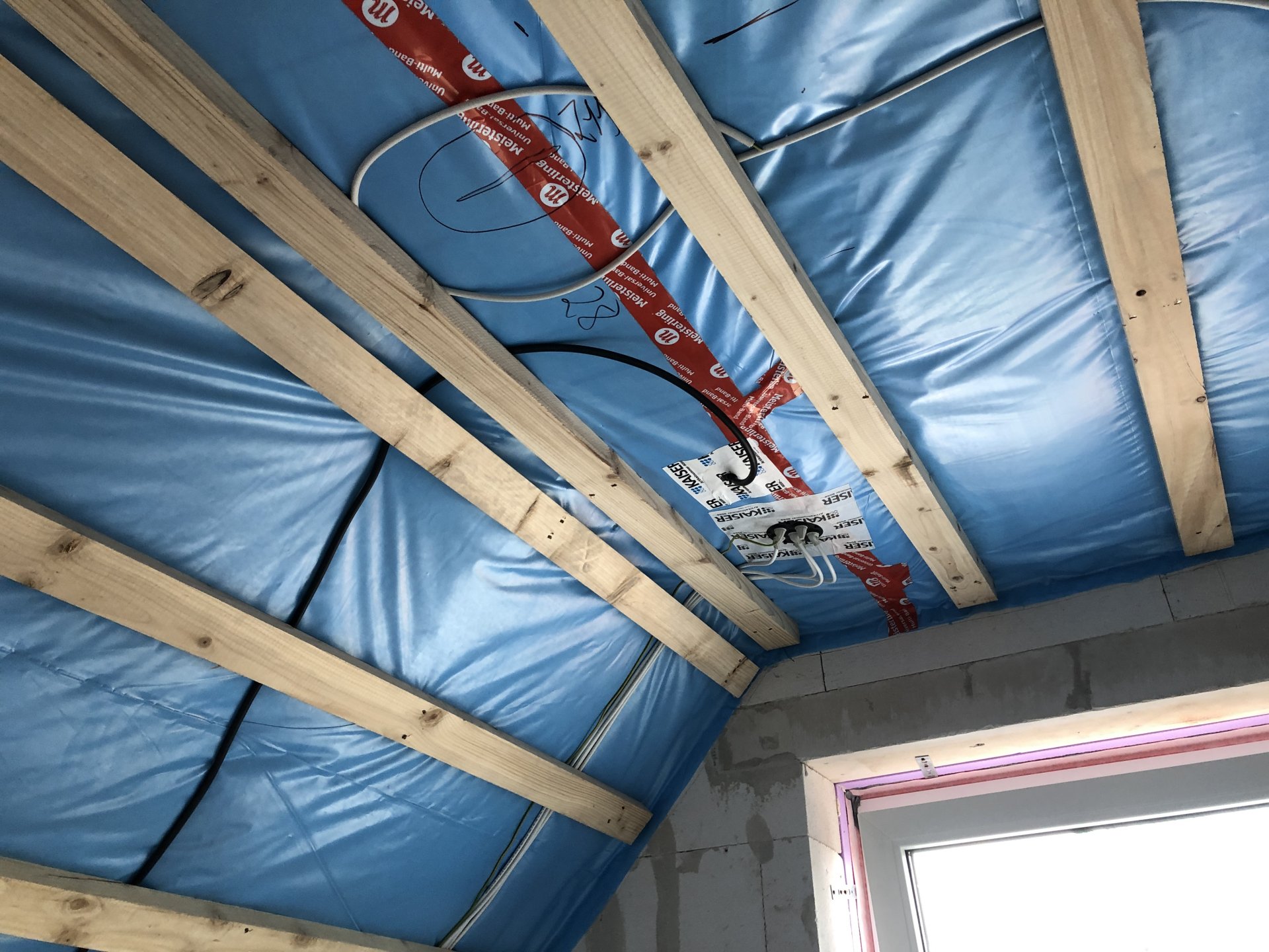 Die frage die ich mir stelle, wo kommt das Kondensat denn rein, bzw nach oben. Das muss doch schon in der Nähe sei wo die Wolle nass war oder? Kann das tatsächlich die Tackerstelle sein? Also am besten jetzt bis Ende nächster Woche warten mit dem öffnen der Folie nach oben? Montag wird der Putz fertig sein und das Wetter wird ja auch Richtung 20 Grad laufen... Estrich haben wir noch nicht und noch keine Heizung.