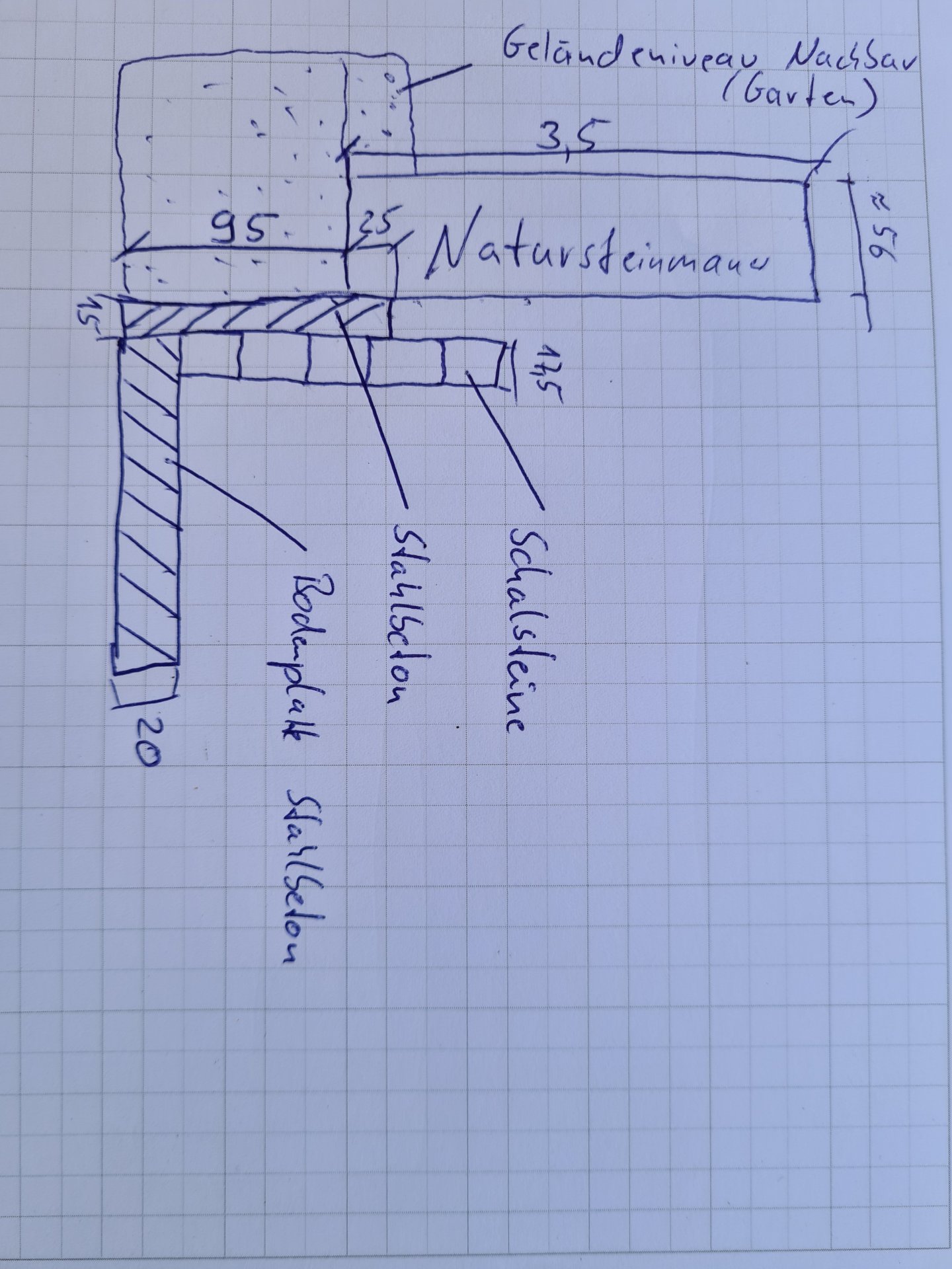 1m Natursteinmauer ohne Bewehrung: Hallo zusammen, ich plane eine 4m lange und 1 m hohe Mauer zu bauen. Ich habe ein Hanggrundstück und habe einen Bereich in 3 Plateaus aufgeteilt.... -