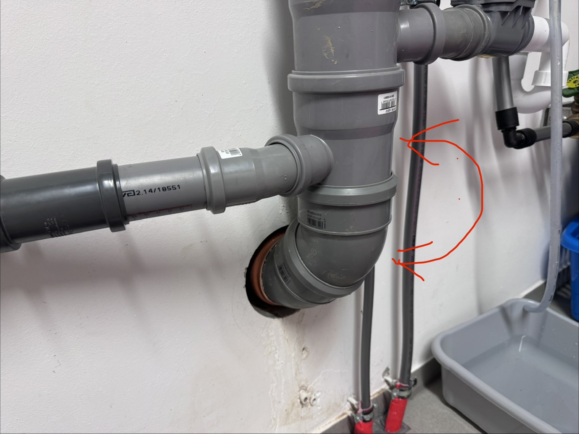 Mein Plan wäre nun, am großen Fallrohr den einen Bogen mit dem seitlichen Anschluss nach unten zu versetzen, ich habe es im Bild entsprechend markiert. Der untere Bogen soll durch einen Bogen mit seitlichem Anschluss ersetzt werden, das Rohrstück wo jetzt der seitliche Anschluss sitzt, soll durch ein Rohrstück ersetzt werden ohne seitlichen Auslass.
