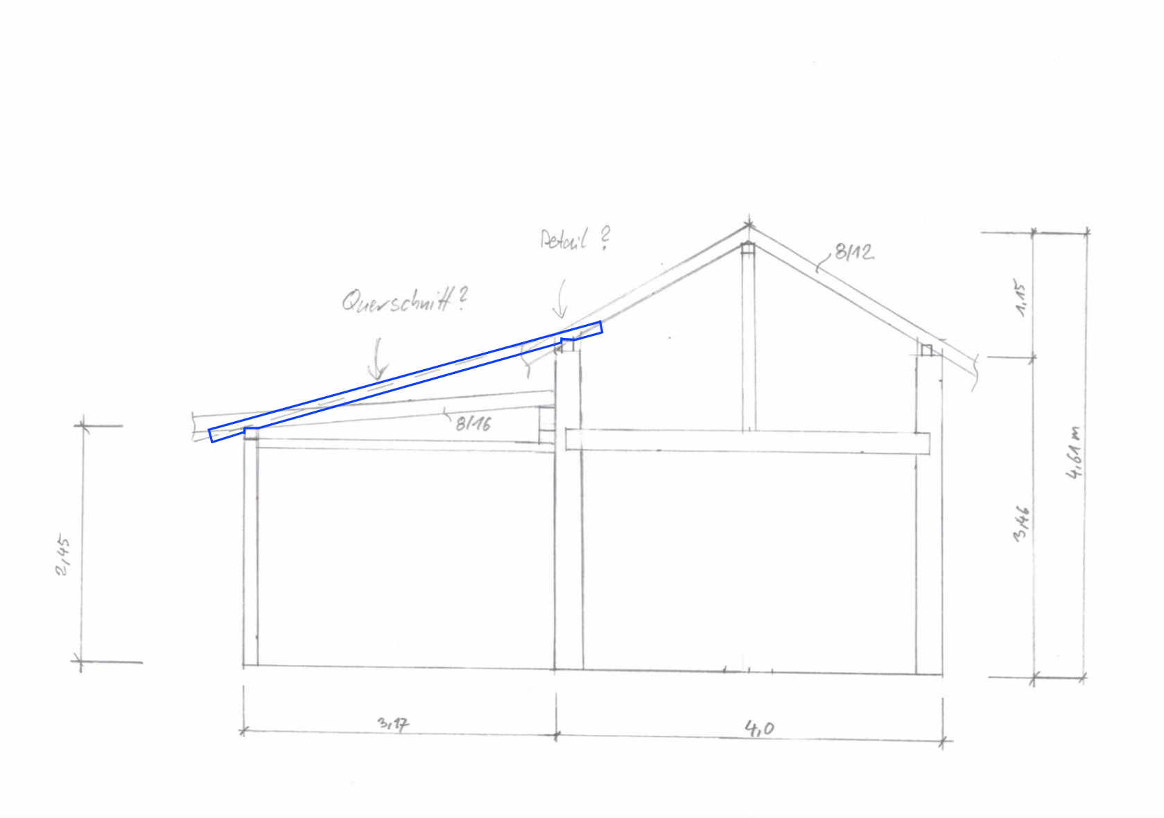 Die Skizze von dem Zimmermann passt schon soweit. Auch auf die Sparren vom Garagendach wirken nur Vertikalkräfte. Nur der Querschnitt der Sparren muss etwas größer sein wegen der geringen Dachneigung.