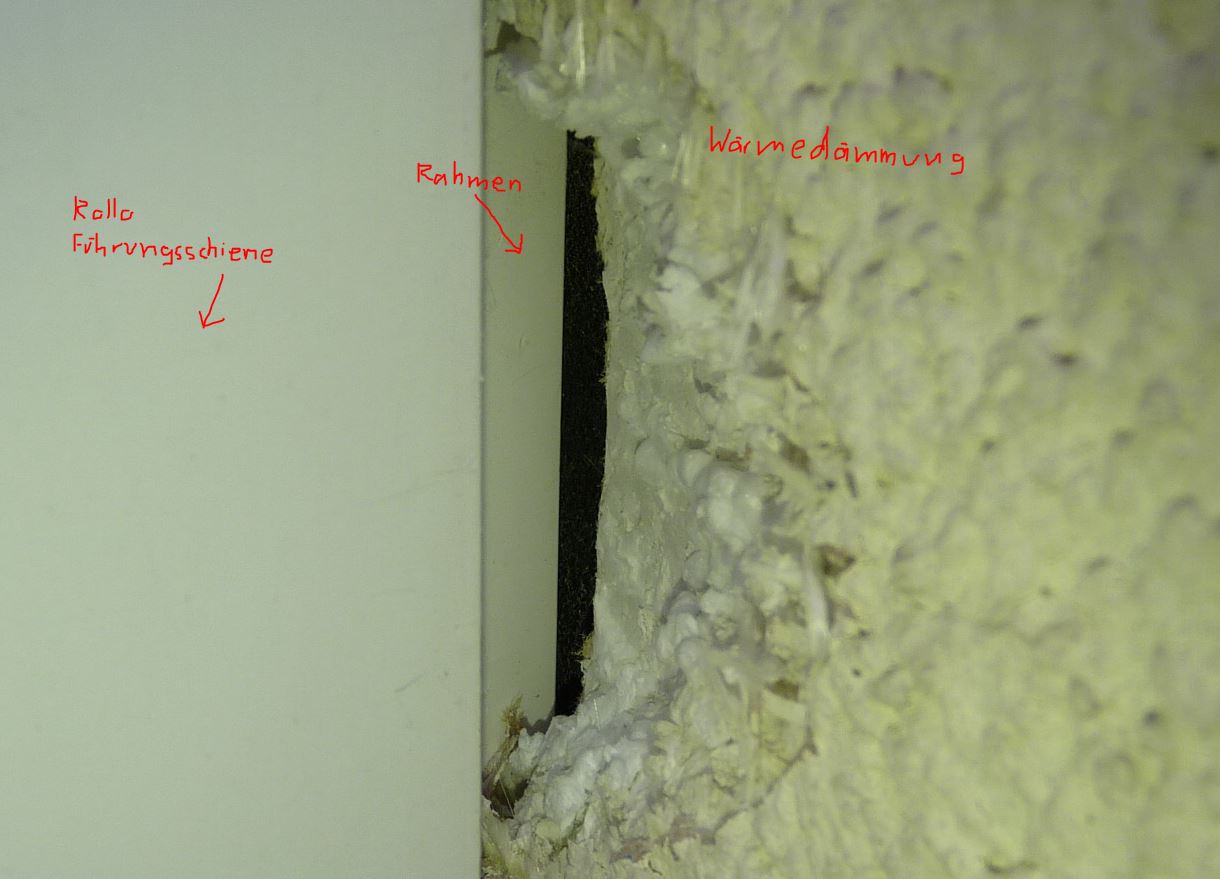 Gerne, das Problem ist dass man da gar nicht viel sieht weil außen die Wärmedämmverkleidung übersteht ca. 8mm (rechts) dann ist eine Fuge (Abstand ca. 1 cm) zur Rolloführungsschiene (hab ich gestern vergessen: die Rollos sind außen montiert).