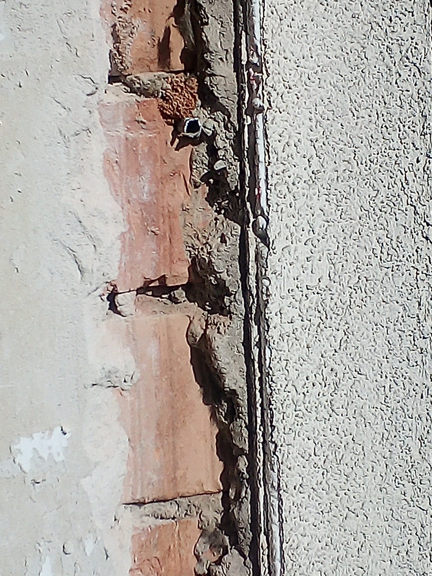 Ich hab jetzt mal etwas von der Ecke der Dämmung abgeschlagen um von außen reinschauen zu können: