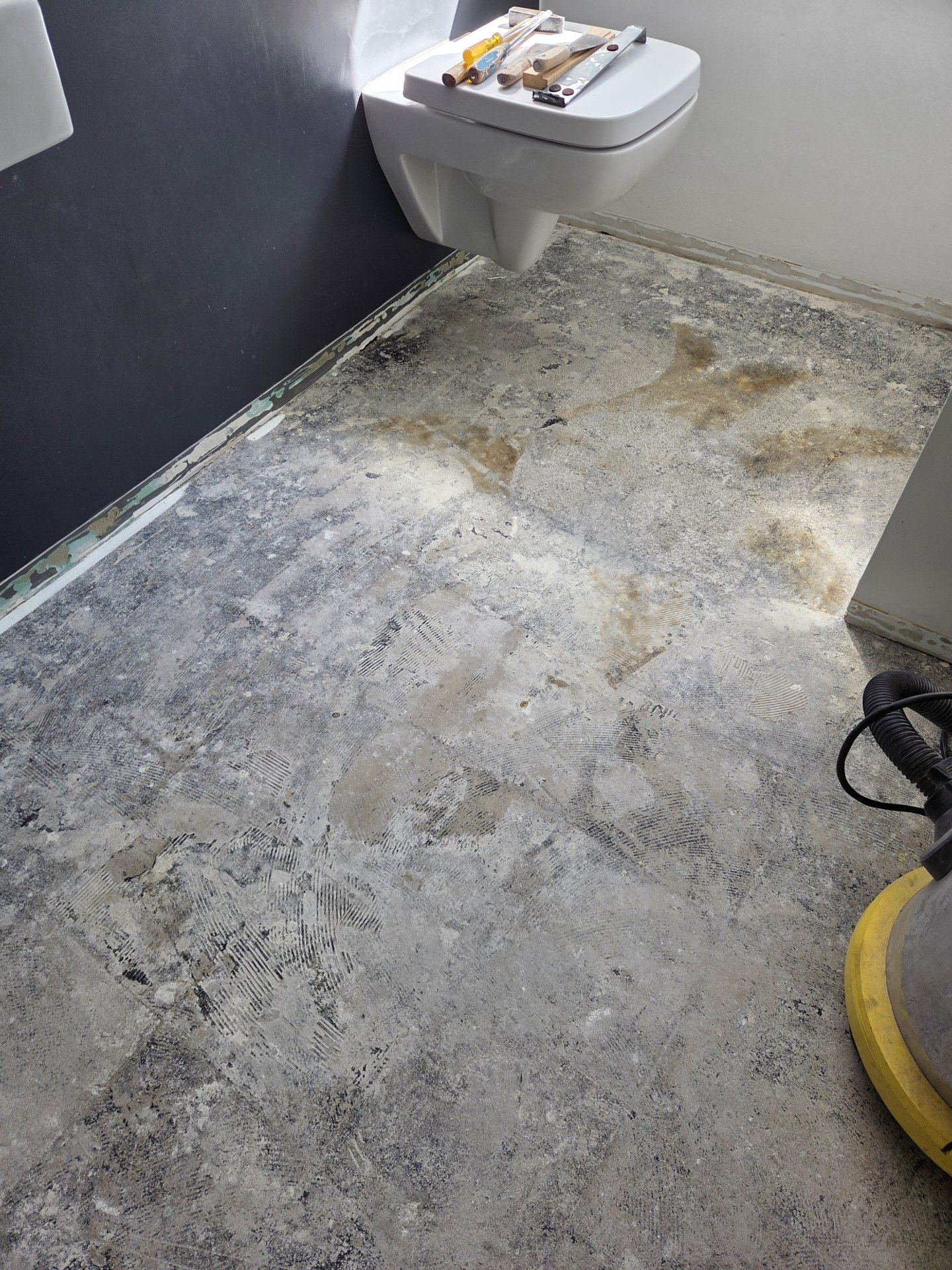 Generell scheint der Boden auch noch nie eine Verbunddichtung gesehen zu haben. Diese würde ich ebenfalls aufbringen (Flüssigdichtung aufstreichen).