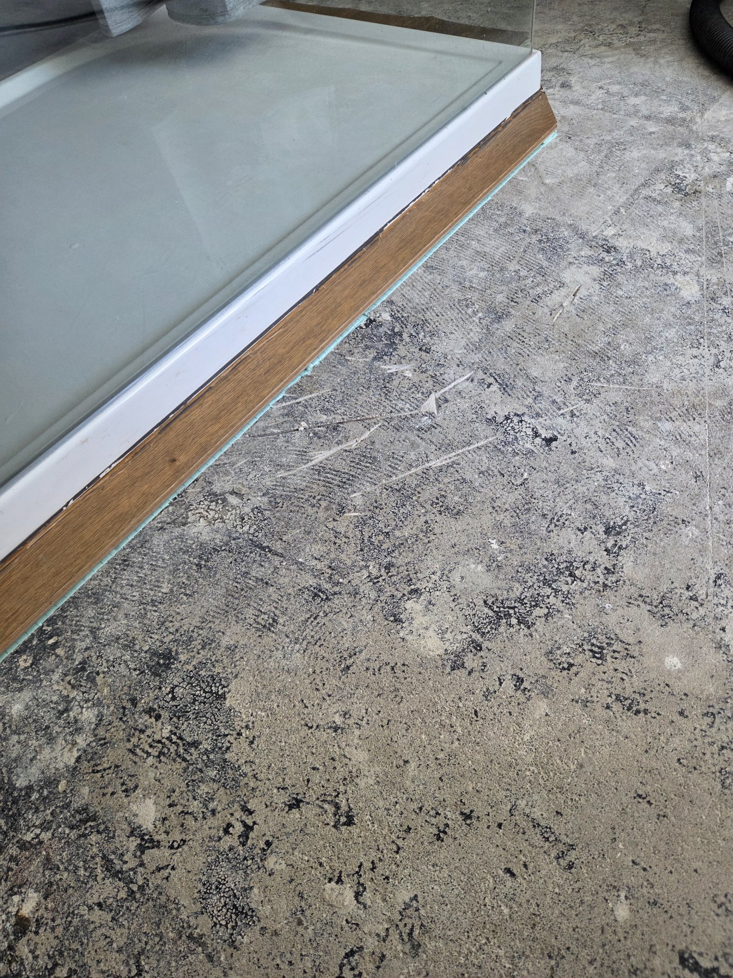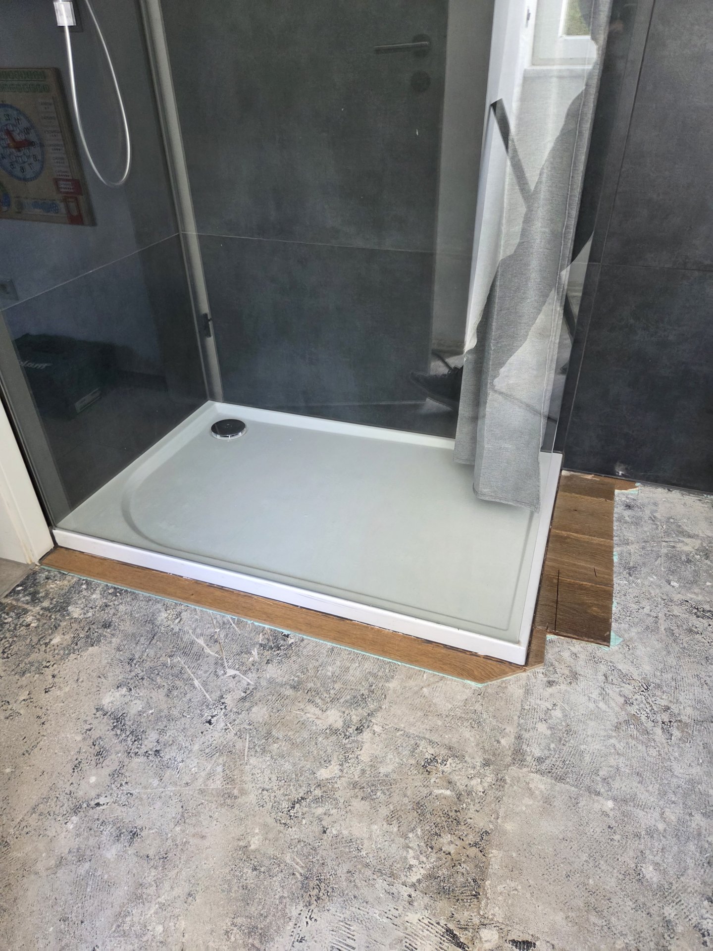 Das "Problem" ist, dass die Duschwanne (begehbar, offen, nur eine Glas Seitenwand) damals anscheinend auf das Parkett gesetzt wurde. Eventuell gab es vorher eine kleinere Duschwanne und das Parkett wurde nicht ausgeschnitten. Warum man das so gemacht hat, erschließt sich mir nicht.