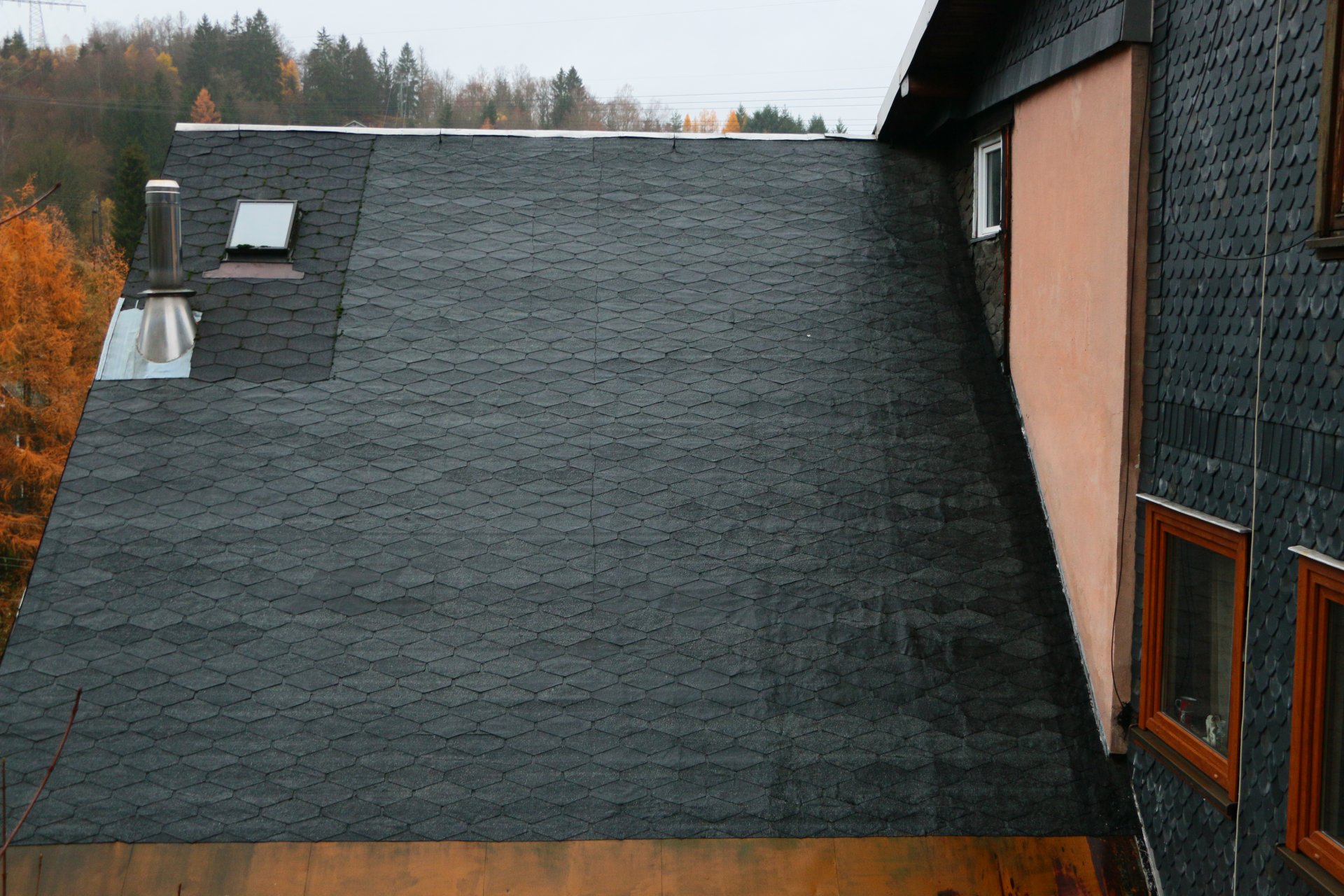 Aktuell sind mehrere Lagen Bitumen/Bitumenschindeln gelegt. Es scheint, als wurde bei Problemen einfach eine weitere Schicht drüber gelegt.