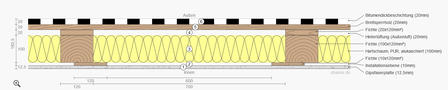 Eine Besonderheit ist, dass wir bauseitig vom Dach her keine Hinterlüftung bzw keine 2. Dachhaut haben. Auf den Sparren sind flächendeckend Dachlatten genagelt und darauf dann das Bitumen ebenfalls genagelt.