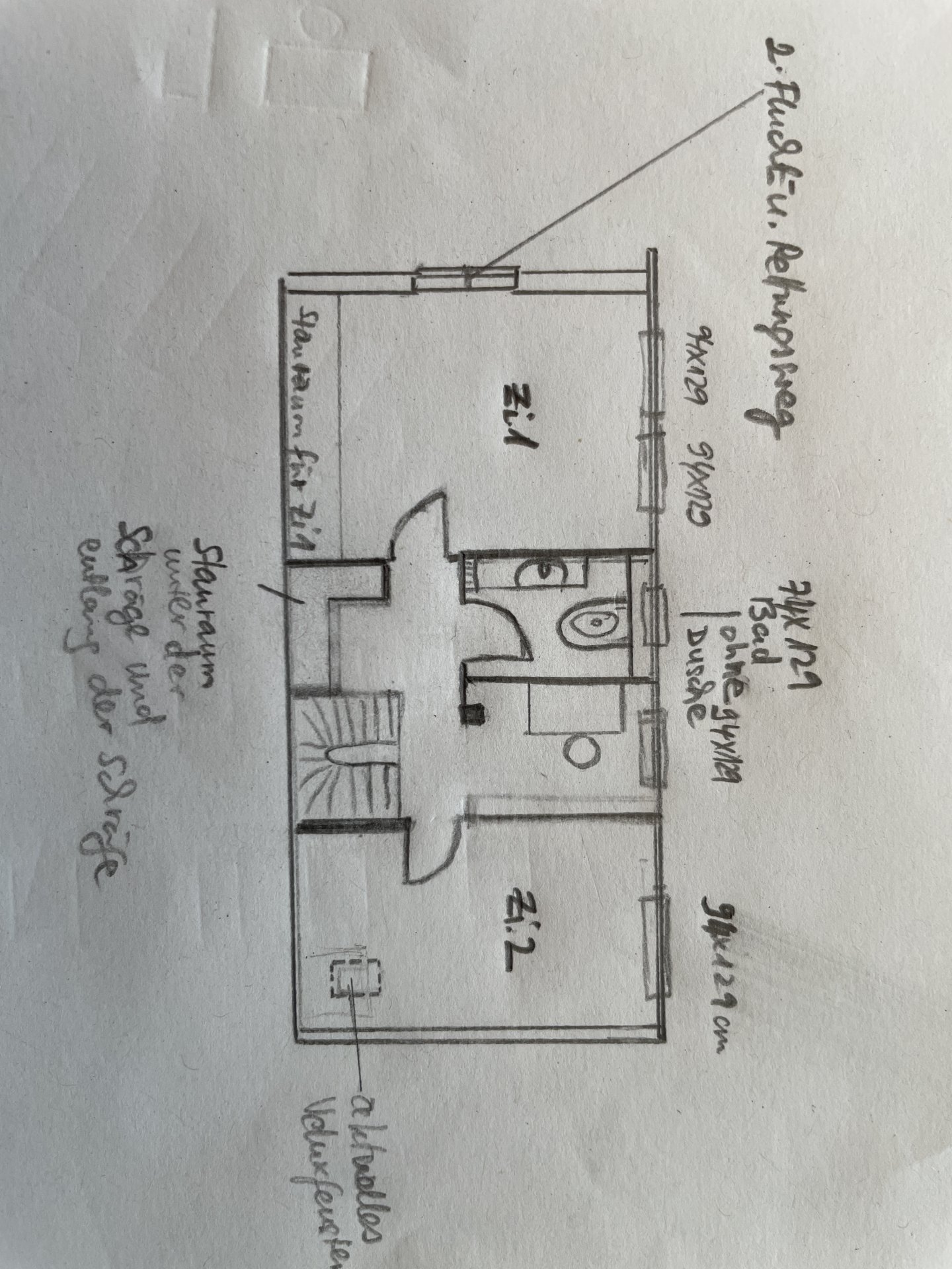 IMG_3011.jpeg Ich würde nach Deiner Skizze Bad und Stauraum tauschen und den Stauraum im ganzen HO im Drempel unterbringen, analog dem Kinderzimmer. Dann hast Du ein wirklich großes offenes HO, was auch als Spielflur oder ähnliches dienen kann. Das HO dann mit Velux-Fenster.