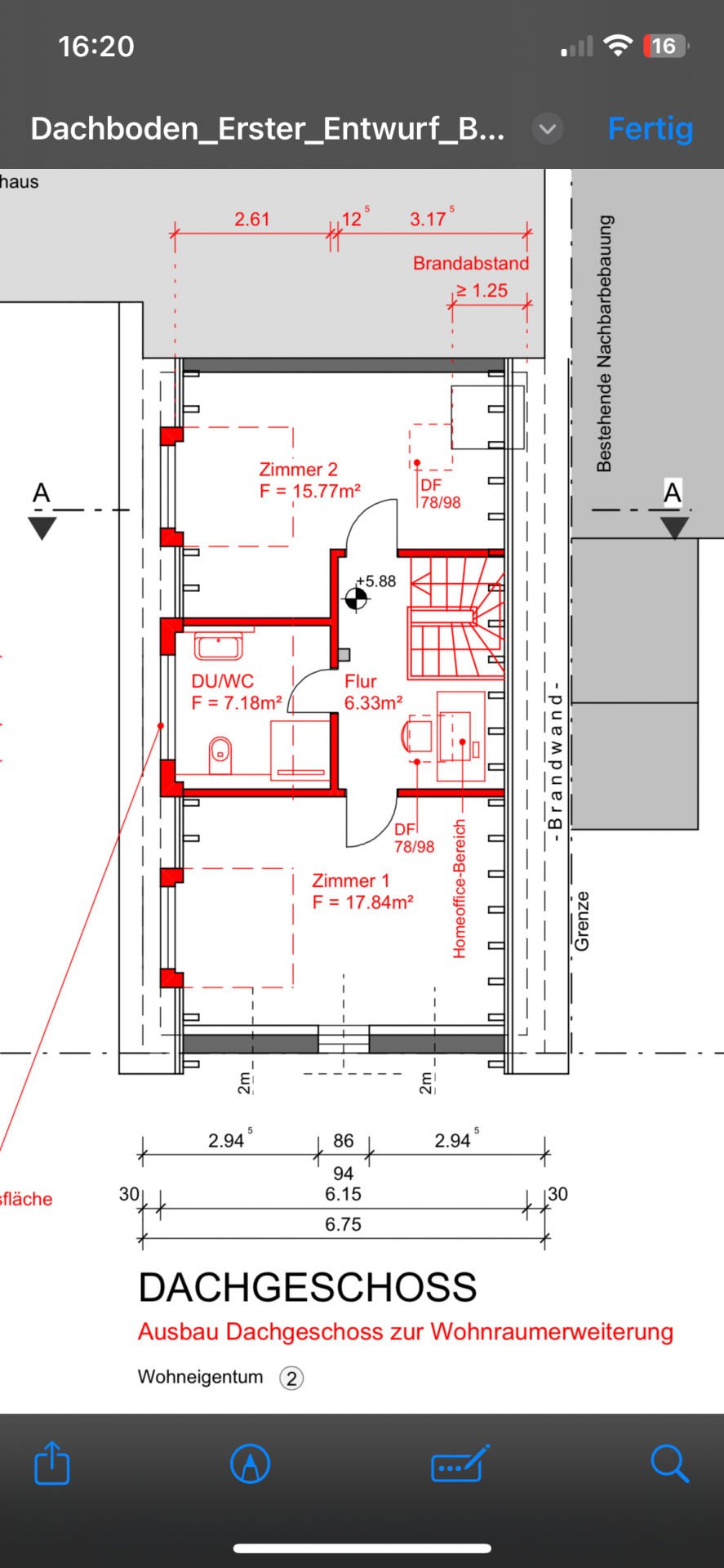 Wir bauen den DB aus. Weil wir wenig Erfahrung haben und möglicherweise eine Baugenehmigung brauchen, haben wir ein Architekturbüro beauftragt. Allerdings waren die ersten zwei Entwürfe nur durchwachsen. Als wir noch Gauben wollten, gab es dafür eine mehr als besprochen und kein Licht im Flur und Treppenaufgang. Sehr ernüchternd. Daraufhin baten wir um Dachflächenfenster und mehr Licht, ein HO und bekamen den beigefügten Entwurf. Was meint ihr hierzu? Die eine Seite ist eine Brandschutzwand, deshalb kann man da nicht viel machen. Beim letzten Mal war mir wichtig, dass die Architekten Stauraum einplanen, ein HO mit Licht (zuvor war es links neben der Treppe), gut geschnittene Zimmer und ein kleines Bad, eventuell sogar ohne Dusche. Es soll im DB Wohnraum für meine baldigen Teenager entstehen und ich muss irgendwo vormittags zwei Tage die Woche arbeiten. Wenn ihr eure Ideen nicht mit mir teilen wollt, kennt ihr online Möglichkeiten, wo ich einen Grundriss-Check durchführen kann? Ich kenne zwei, allerdings geht es da um 400€ und meistens ein ganzes Haus. Ich hab aber nur quasi einen Stockwerk. Ich werde das Gefühl nicht los, dass irgendwas fehlt. Und ja, ich könnte mit dem Büro nochmal reden, aber das möchte ich erst, wenn ich von jemandem Unbeteiligten Eindrücke gesammelt habe.