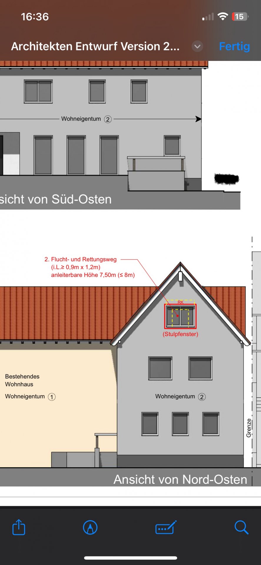 Was meint ihr zum 2. Flucht- u. Rettungsweg? Da wurde vorgeschlagen das Fenster zur Straße als Stulpenfenster mit den geforderten Mindestmaßen zu beantragen. Wenn schon Vergrößerung, haben wir uns gefragt, ob nicht ein bodentiefes Fenster mit Unterlicht modern und praktisch wäre?!