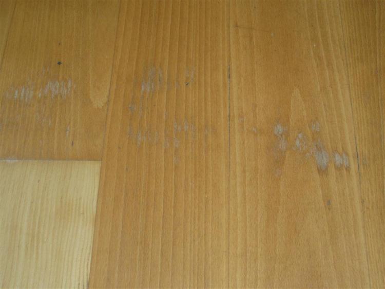 Neulich haben wir nicht aufgepasst und mein Sohn hat seine Dreck-/Schneeschuhe ins offene Schuhregal statt auf die Matte zum Abtropfen gestellt. Also eine kleine Lache auf dem Parkett, die dann ausgetrocknet ist. Ich hätt's nicht gedacht: Mit Parkettseife abgewischt und man sieht nichts mehr.