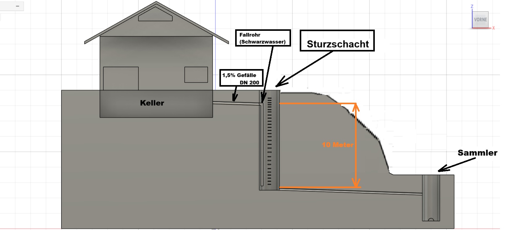 Das steht auf einem kleinen Berg/Hügel. Der Sammler fürs Abwasser liegt unterhalb auf der Straße. Meine Frage, wie Tief kann ein Sturzschacht sein? Der Höhenunterschied liegt bei ca. 10m.