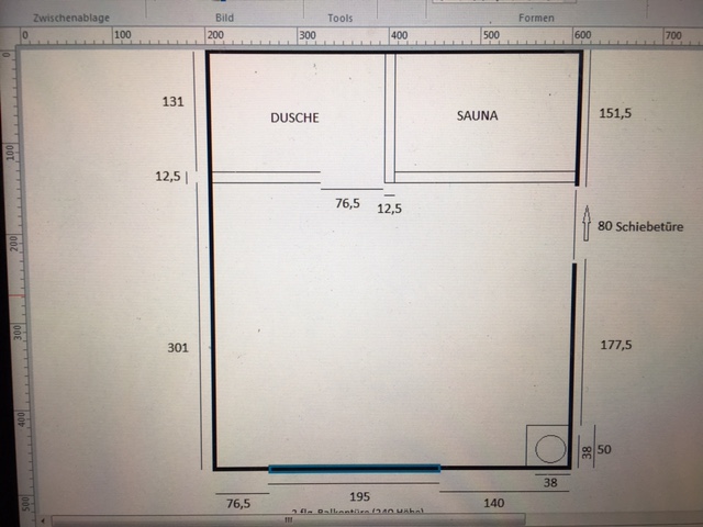 Anschlüsse sind noch flexibel; alles möglich. Fenster ist in Skizze eingezeichnet. Dusch u. Sauna (aktueller Stand) ebenso....
