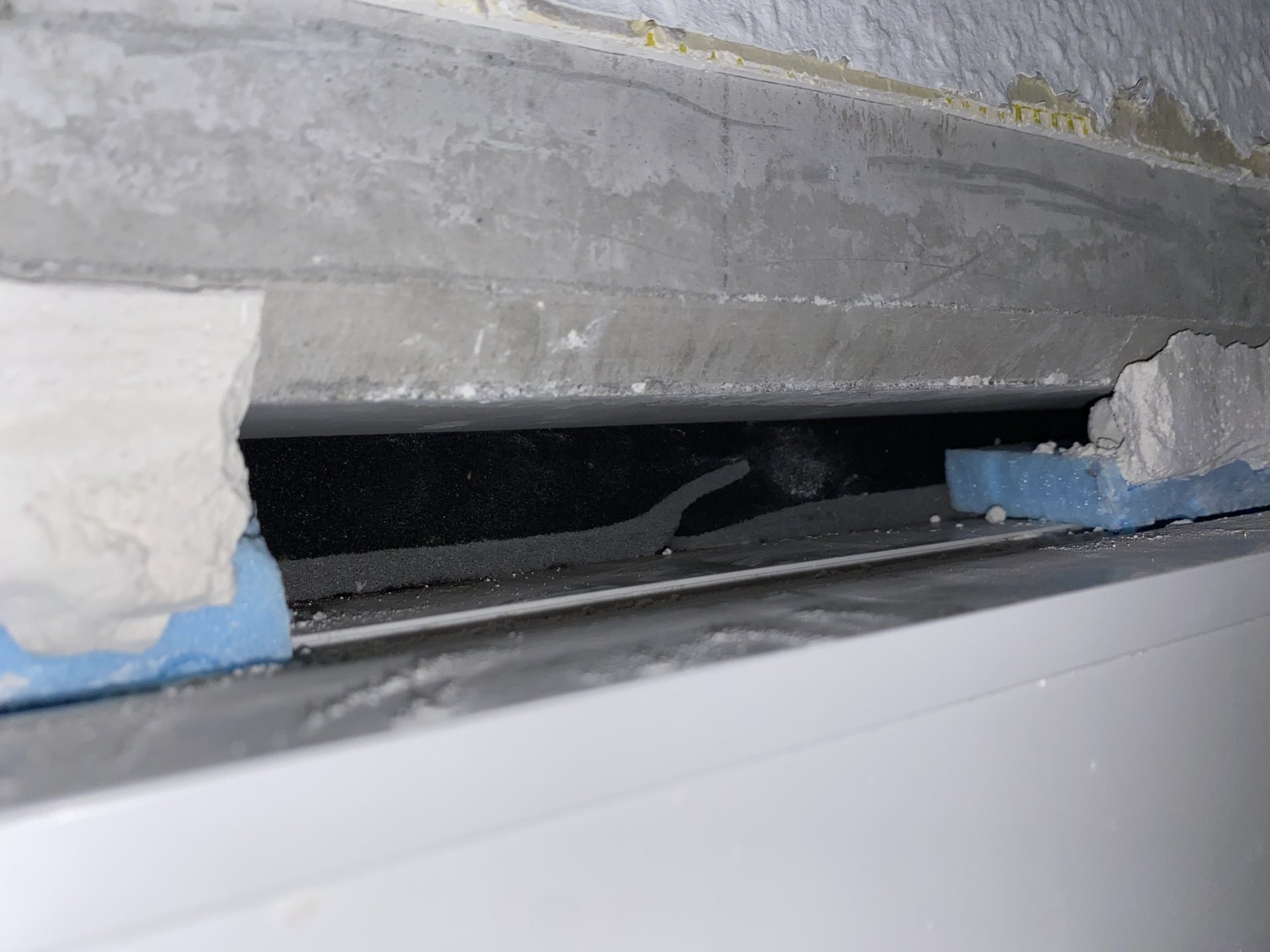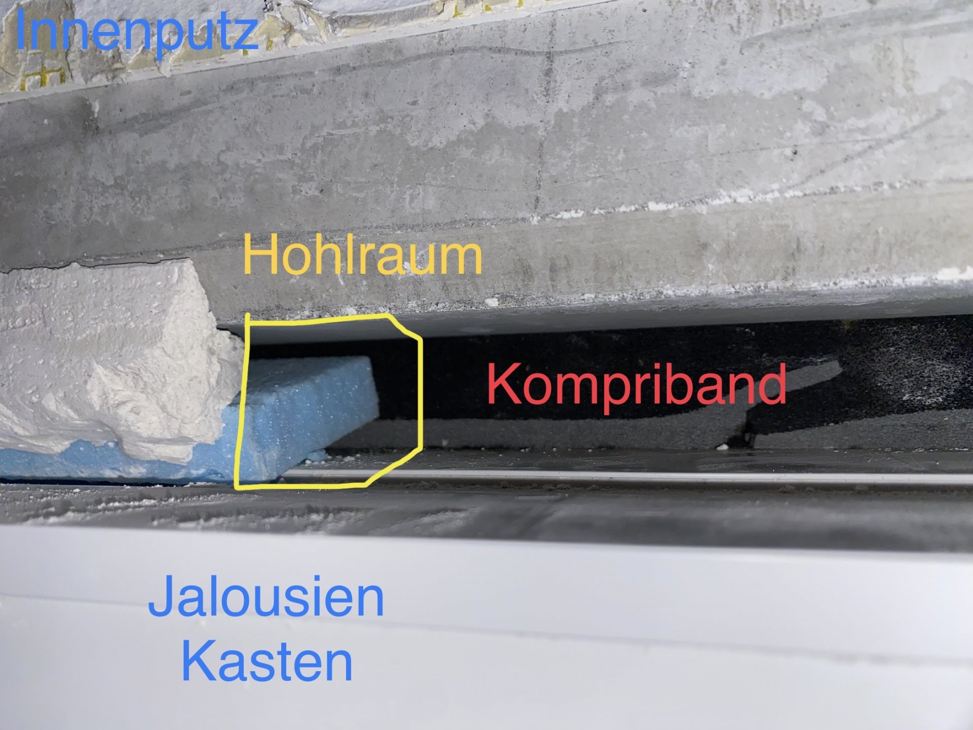 Zwischen Kompriband und Putz habe ich ein Hohlraum festgestellt. Da sind zwar Stücke Hartschaumdämmung reingelegt worden aber die füllen nicht die gesamten Bereich aus.