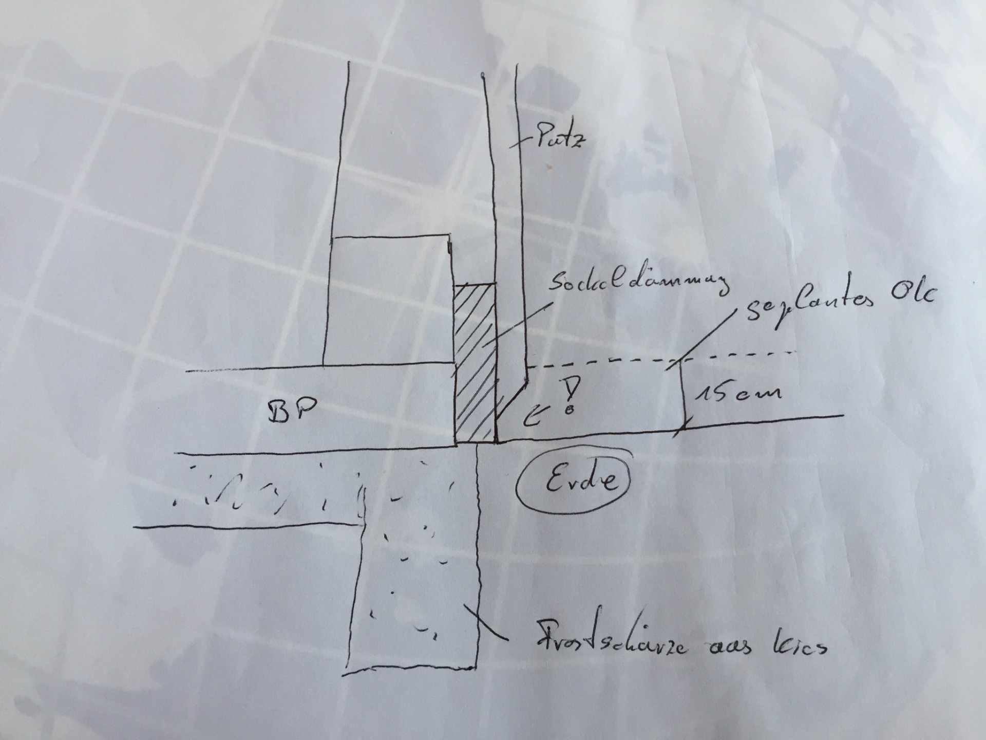 Bodenplatte liegt auf Kies. Dämmung nur im Sockelbereich, diese geht nicht in den boden, 50cm tiefer würde ich Erde abdichten.