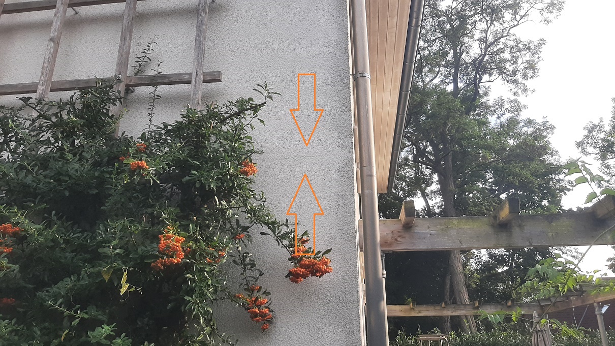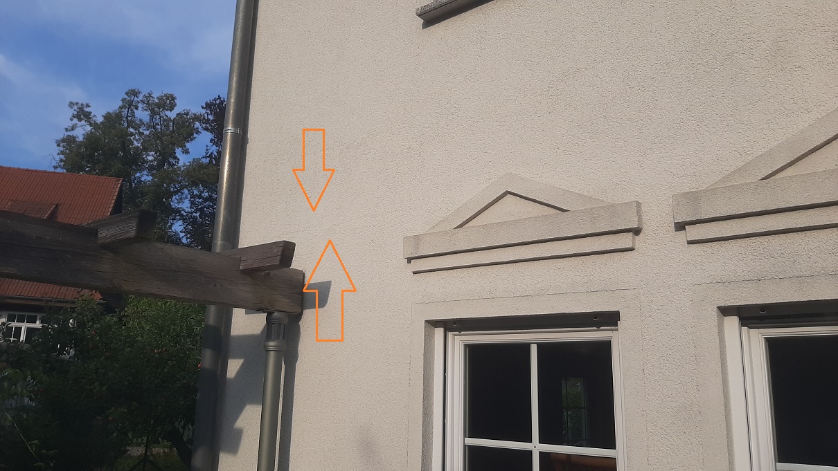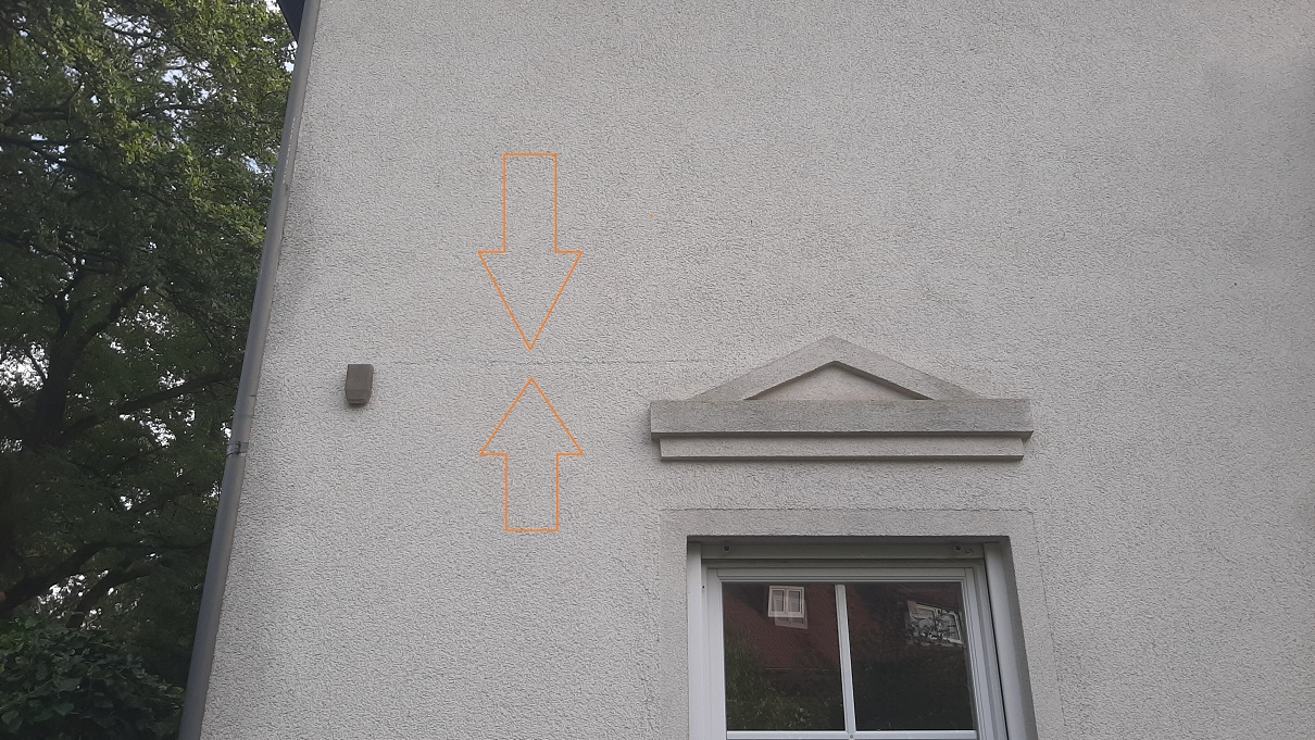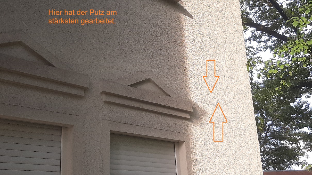 Einspritzen von Acryl ist aber auch dann weiterhin die richtige Saniermethode? Mich irritiert ein bisschen, dass die Risslinie so deutlich zu sehen ist. Der Riss selbst dürfte doch eigentlich nur ein Haarriss und damit kaum sichtbar sein. Die Struktur des Putzes ist aber auf einem deutlich sichtbaren Streifen von 2-3 cm anders, als ob da eine Stufe im Putz ist. Als mir das zuerst an der einen Hausecke aufgefallen ist, habe ich zuerst gedacht, der Putzer habe hier Mittagspause gemacht und nach der Pause neu angesetzt. Bis mir dann aufgefallen ist, dass das ums ganze Haus herum immer wieder mal zu sehen ist. Ich frage mich nun, ob nicht schon Feuchtigkeit unter den Putz gekrochen ist und das Material aufgequellt hat (siehe auch meine Überlegungen zu dem Putzabplatzer an der Säule im Ausgangspost). Da dann einfach Acryl reinzuspritzen kommt mir nicht ganz richtig vor. Müsste man nicht eher den gequollenen Putz entfernen, eine Rissüberbrückung machen und neu aufputzen?