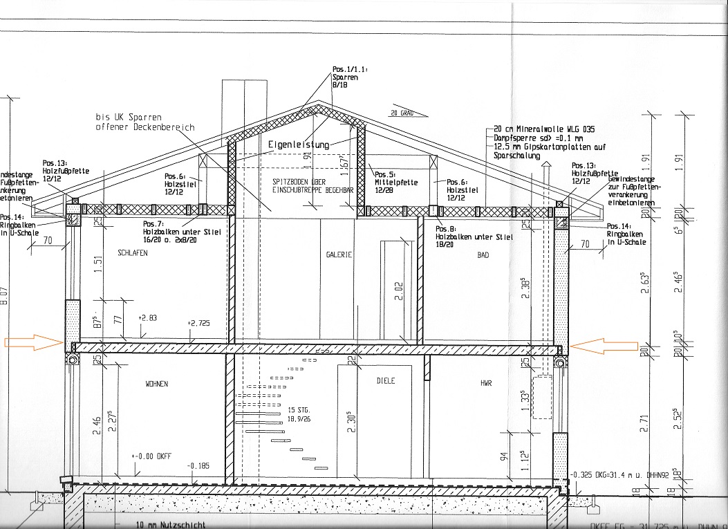 danke für den Hinweis. Ich hänge hier ein paar Fotos vom Rohbau an. Dort erkennt man eine umlaufende schwarze Linie, dreieinhalb Steinreihen unterhalb der Fensterbrüstungen im OG - vermutlich eine Katjabahn? Auf dem Foto vom Innern des Hauses sieht man, dass genau dort (dreieinhalb Steinreihen unterhalb der Fensterbrüstung) die Außenwand des OG auf der 20 cm Betondecke aufsetzt. Die Betondecke wird also von der Steinreihe unterhalb der schwarzen Linie verkleidet; man sieht auch, dass diese Reihe nicht ganz so hoch ist wie die Steinreihen darunter. Ich gehe schwer davon aus, dass dies die Linie ist, wo sich der Riss gebildet hat.